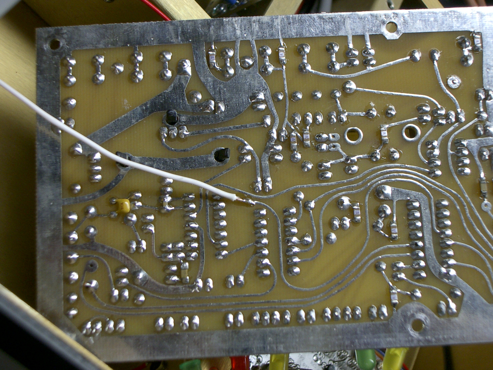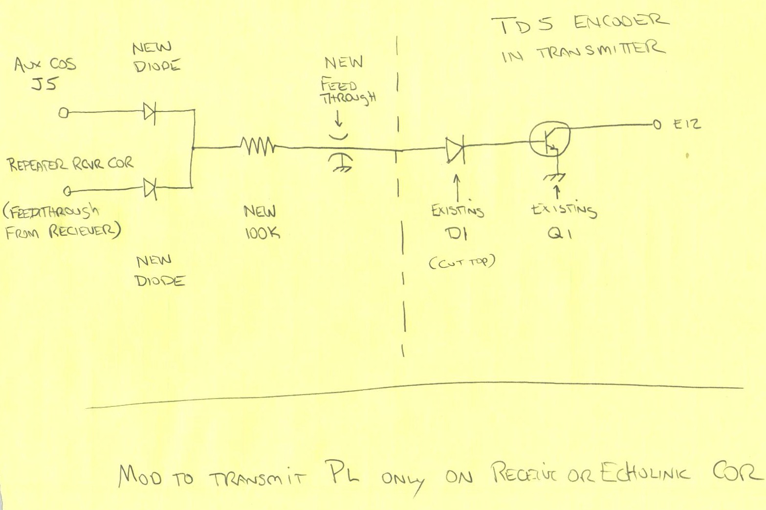 1. Audio into the VA3TO from the repeater comes from the speaker terminal on the repeater. 2. The COR from the repeater was picked up at pin 1 of U7. I soldered a small wire to the trace on the back of the board. The Hamtronics COR-5 board is shown in the picture. Click on the picture for a larger image. 3. The PTT line goes to the auxiliary receiver COR at J5. Modifications to Transmit PL on COR To cleanly link repeaters, you need to change the repeater so that you are only transmitting a PL/CTS tone when the COR from the receiver or from Echolink is active. My repeater has a Hamtronics TD-5 Encoder/Decoder preinstalled. I toggle the PL by causing pin 17 to go to ground when PL is needed. To do this, I turn it on and off using a transistor switch. Since the D1/Q1 switch already on the board was of no use, I cut it out of the circuit and put it to a better use. I cut the top of the lead to D1 and ran it instead to a new feed through filter. I cut the jumper between E10 and E12. I connected pad E6 to pad E12. Now the encoder will send PL when I put a voltage on to the wire to D1. Outside of the transmitter case, I took a 100k resistor to two diodes. One diode is connected to the auxilary COS at jack point J5. The other goes to feed through filter coming out of the receiver compartment that hosts the repeater receiver COR (mine had a purple wire attached to it). Viola, when the Echolink or the receiver sees a signal, PL is turned on. Otherwise it is off. If you would rather, you could investigate the output of the receive decoder and use that line rather than the COR. Then the link would occur only when the receive station had PL. A drawing of the additions is shown below. Click on the drawing for a larger image. Email to: w8iz@w8iz.com Home page: www.w8iz.com |