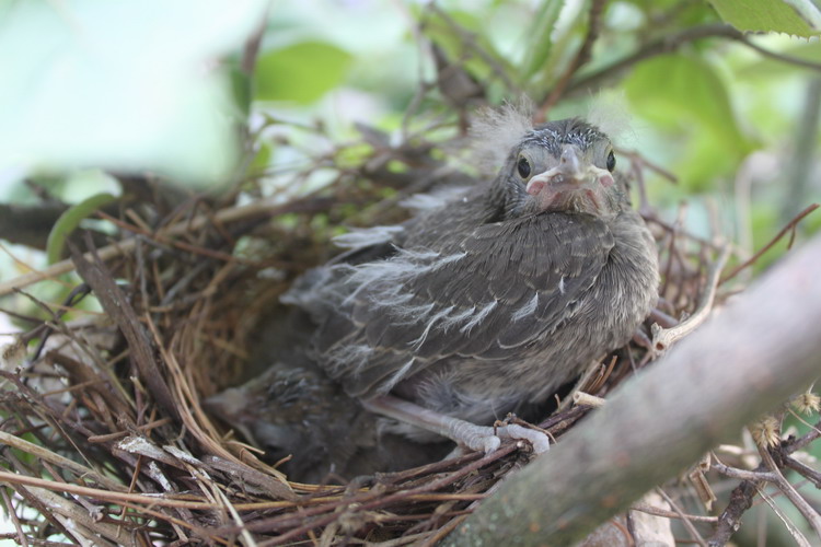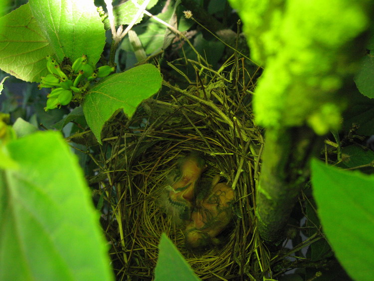 June 11, 2011 - Where'd they go??? After watching a number of sparrow nests raided by a maurading bluejay, I hope they survived. I saw them out exercising their fully feathered wings. There was absolutely no room left in the nest. I've never seen such young birds fly, but, I hope.
