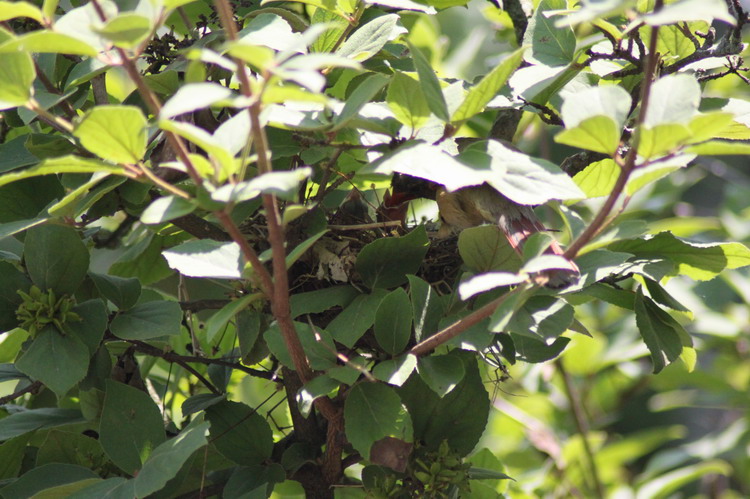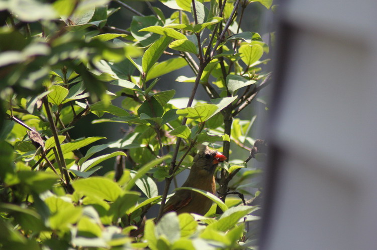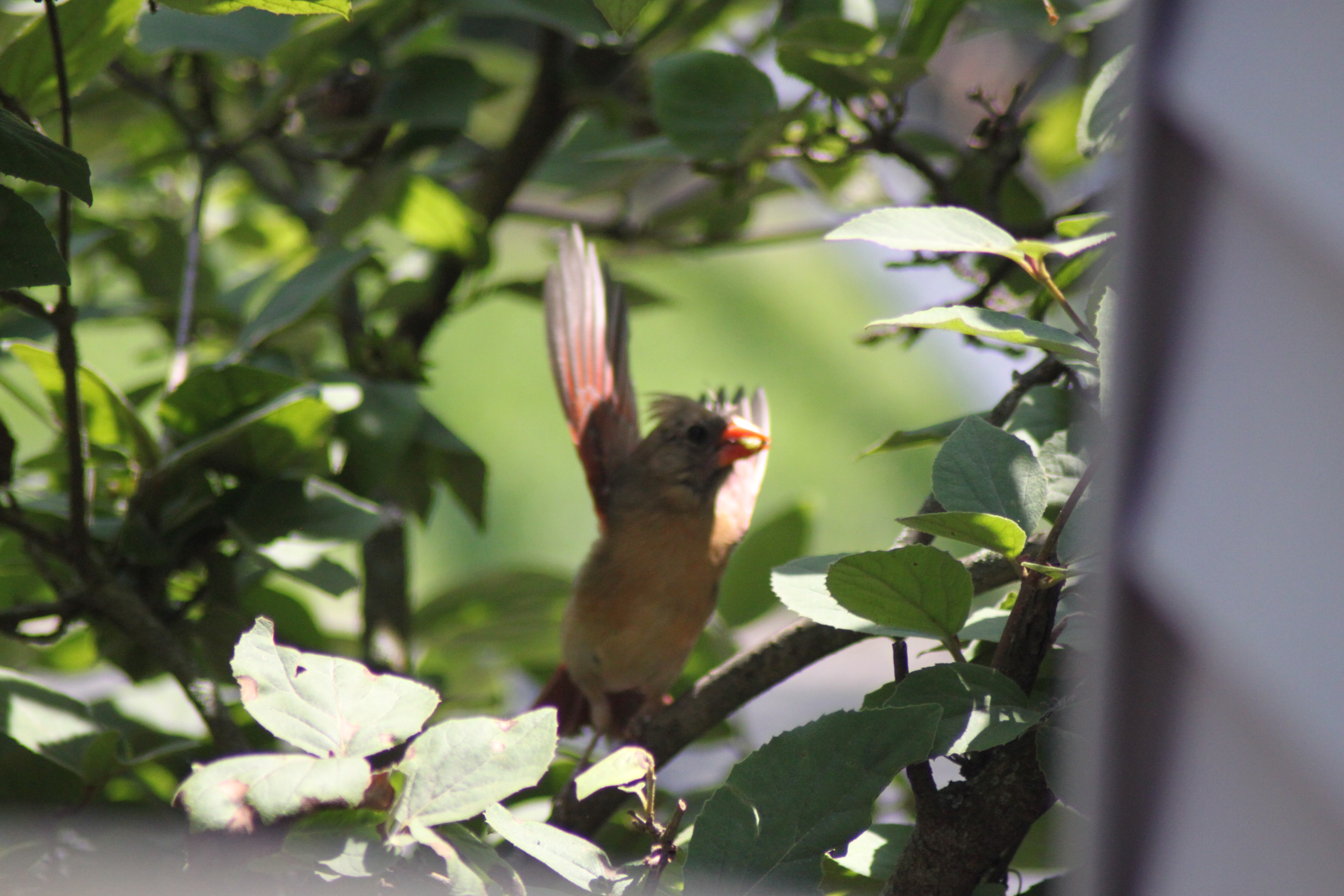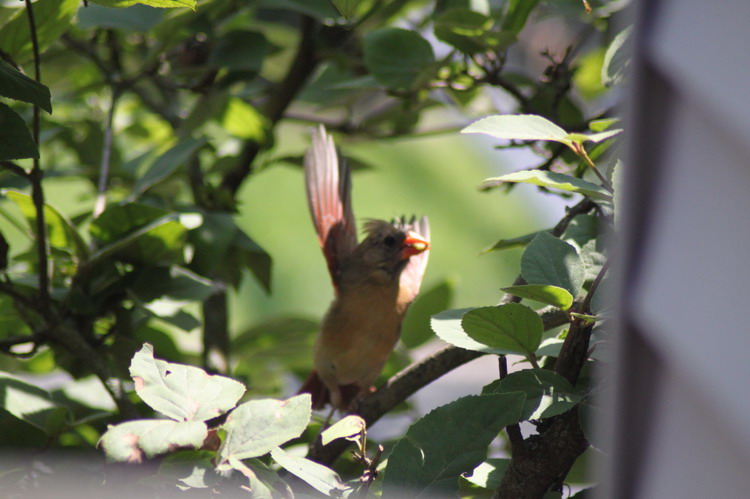 Whenever I am out there, Mom Cardinal is very upset. She raises holy heck. It takes some time and, I'm sure, the bugs she has for her chicks get very old before she summons the courage to return.