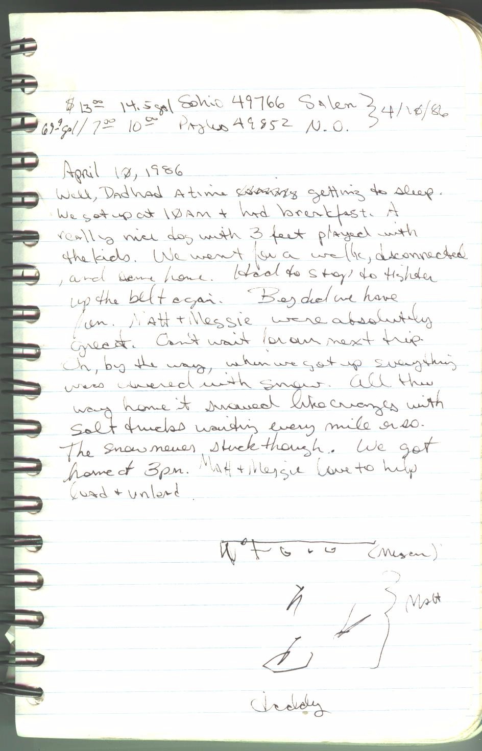 Well, Dad had a time getting to sleep.  We got up at 10 AM and had breakfast.  A really nice dog with three feet played with the kids.  We went for a walk, disconnected, and came home.  Had to stop to tighten up the belt again.  Boy, did we have fun.  Matt and Meggie were absolutely great.  Can't wait for our next trip.  Oh, by the way, when we got up everything was covered with snow.  All the way home it snowed like crazy with salt trucks waiting every mile or so.  The snow never stuck, though.  We got home at 3 PM.  Matt and Meggie love to help load and unload.
