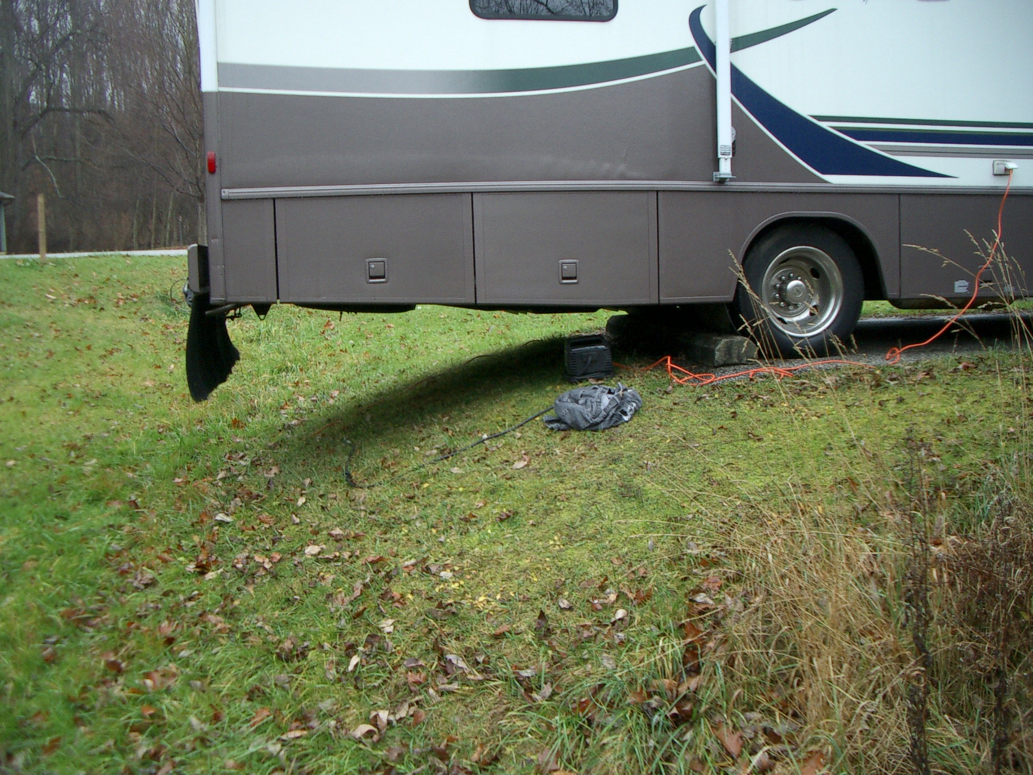 Click for a larger imageSite 47 seems to be the best site available.  It is nice and level although no where near water.  It is OK for now as all water is shut off.  You have to go to the potable water spigot near the dump.  Site 47 offers something special, too.  I can almost walk under the rear of the motorhome to allow myself the opportunity to air up the spare tire.