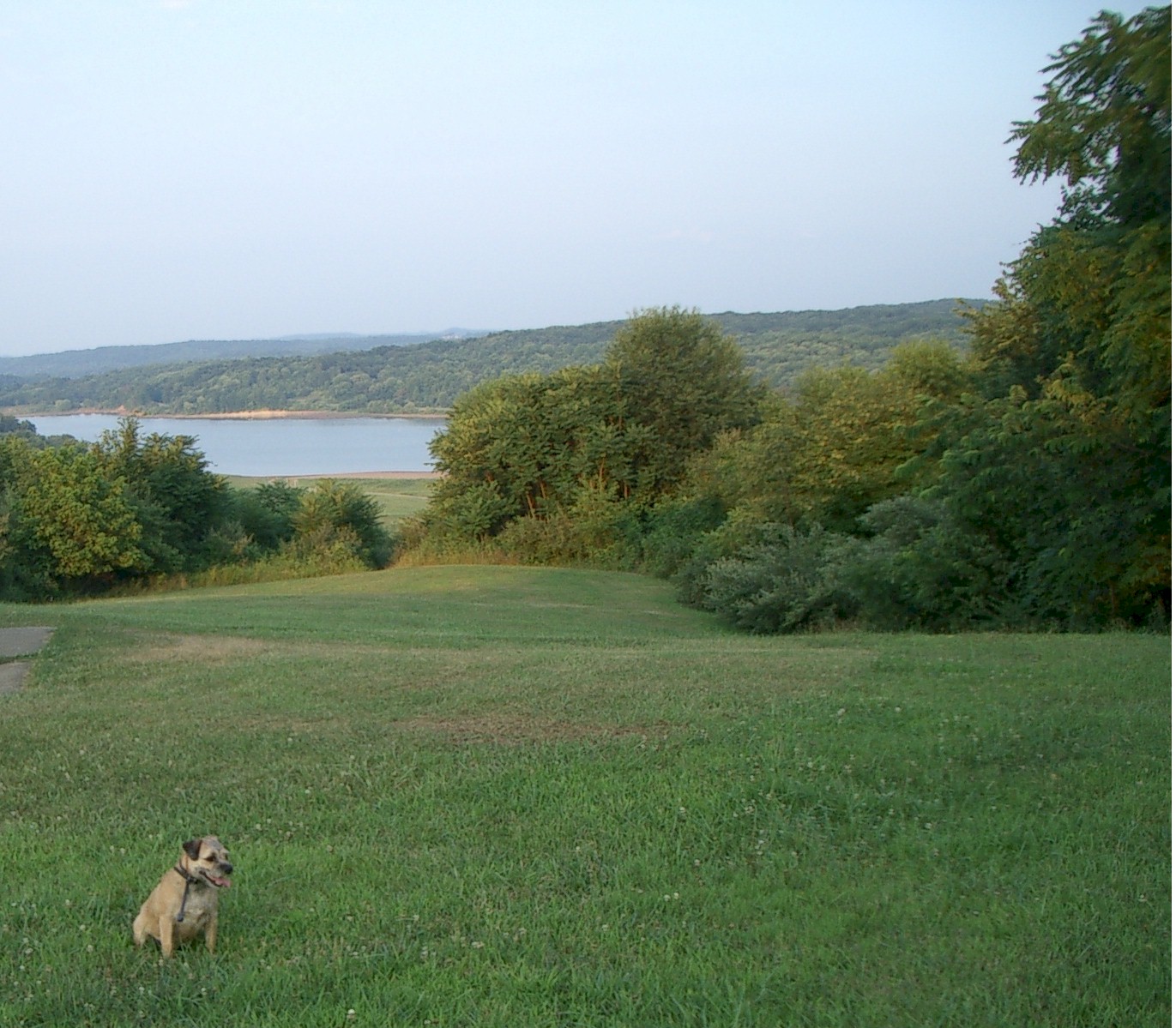 Gracie overlooking Salt Fork.  Click for a larger image.We drove almost 100 miles exploring here, exploring there and nosing around.  We saw the broken dam although it is tucked away from the road.  There appeared to be work in progress to fix whatever is wrong.  There isn't much work but work the are doing.  I took a trip to a grocery store just two miles south on I-77 to pick up some hamburger meat and other fixins for said meat.  I had such a taste for a hamburger that I ended up stopping at Burger King.  That is a move I will regret for some time.  It required a two hour nap.