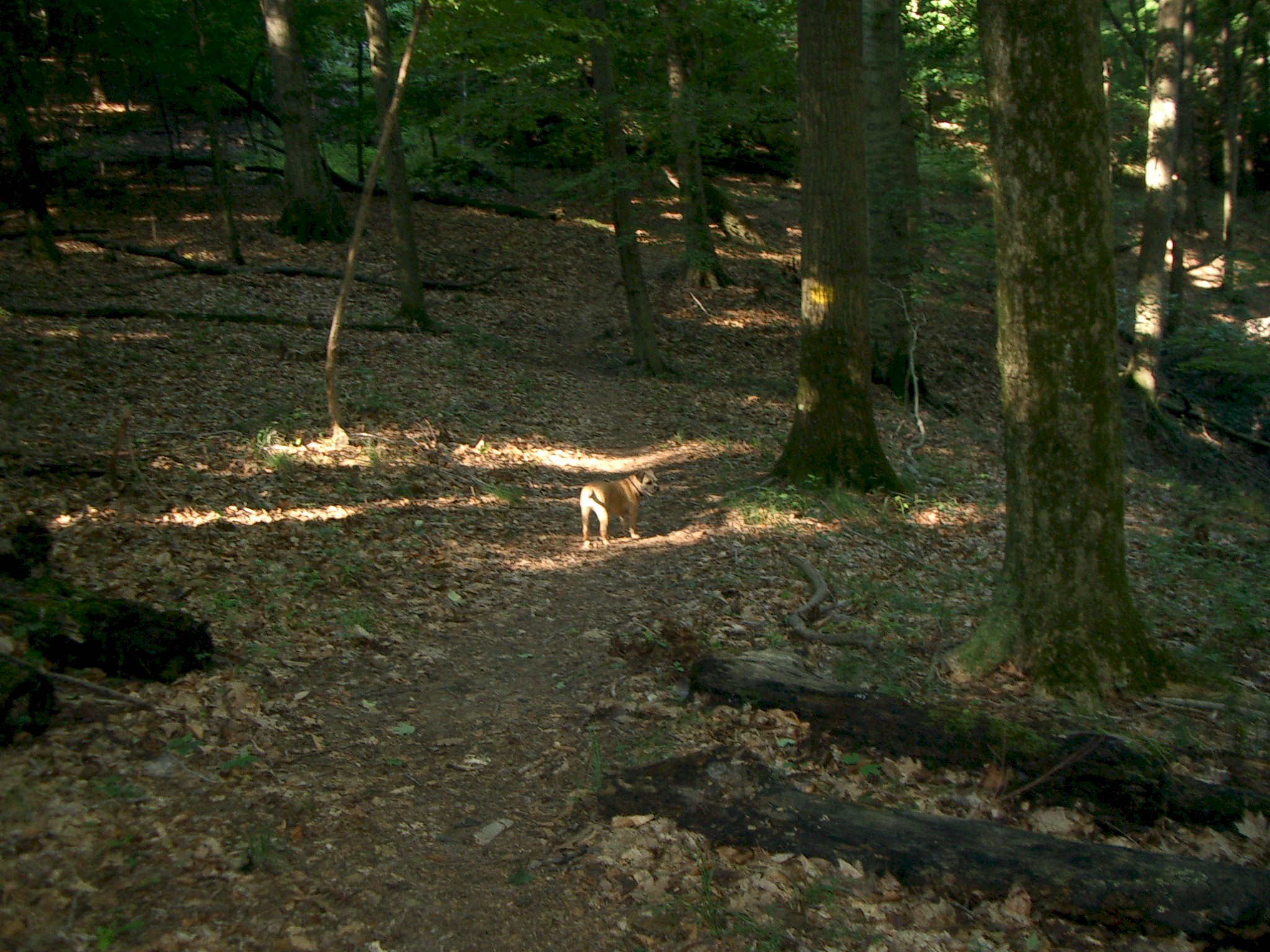 Click for a larger imageIt was a sunny day that called for my hat.  We began by taking a trail walk, our first.  Down was easy.  Here at Salt Fork down is always easy.  It is the up, the part that is four times longer than the down, that is the hard part.  We had a wonderful walk down to the lake.  Grace scared a deer feeding next to the path.  Neither of us saw each other until we had met.  Grace was within two feet of the deer.  Once at the lake, she proceeded to walk in and take a dip to cool off.  That Grace!  Click on both of the images to take a look at the full picture.