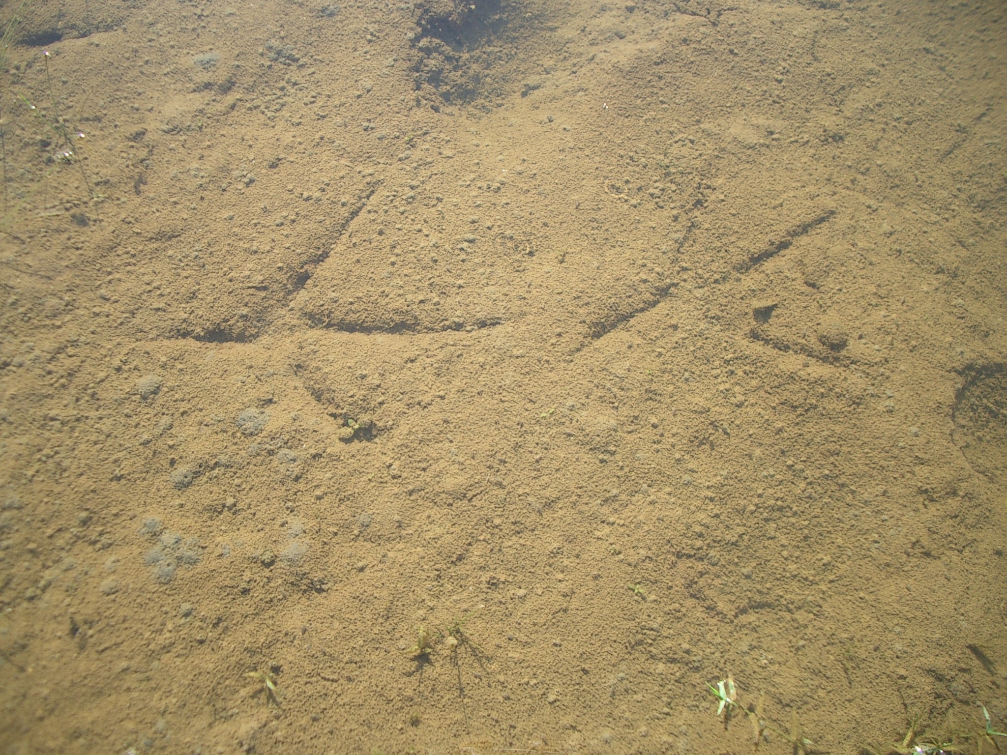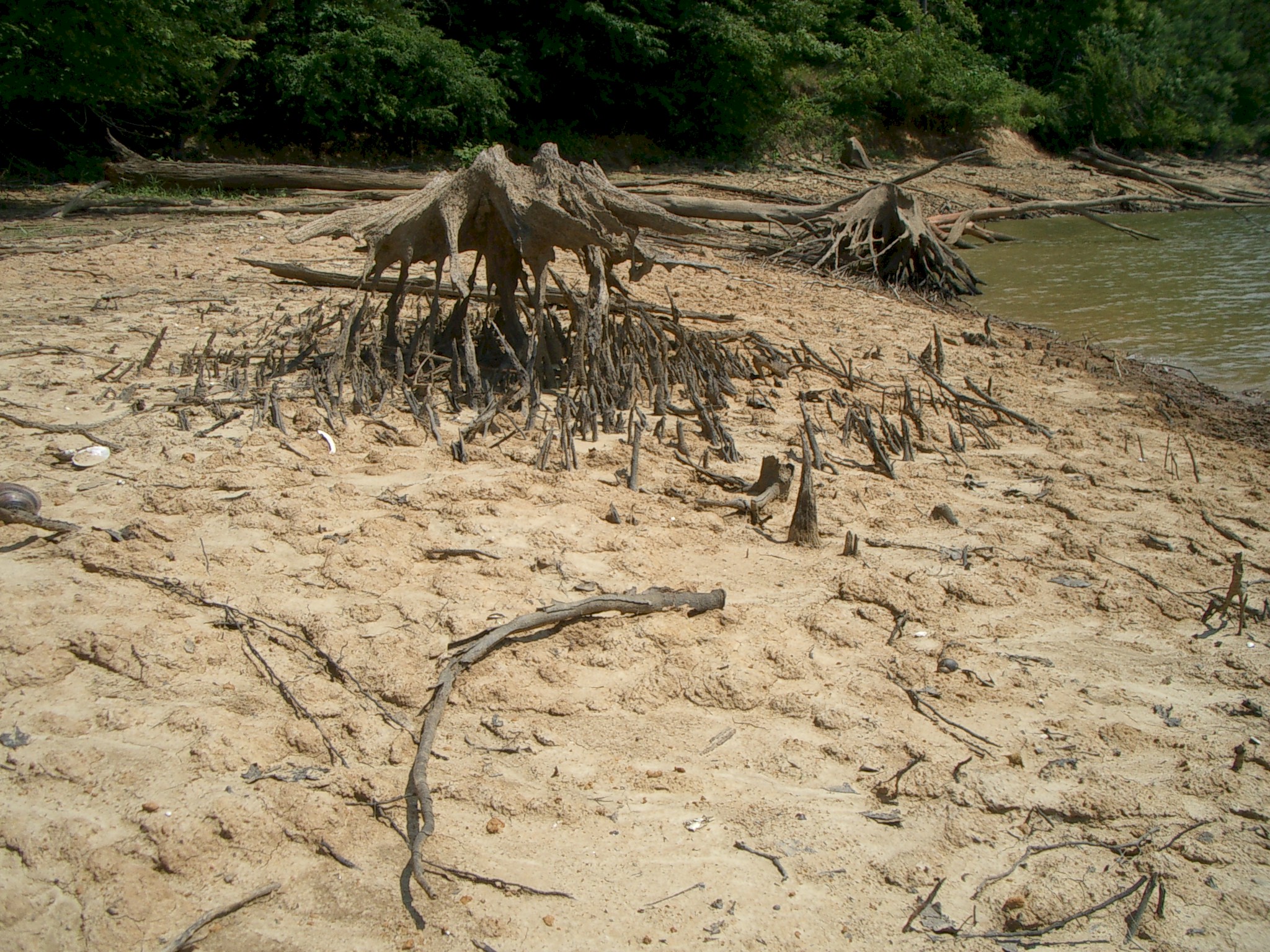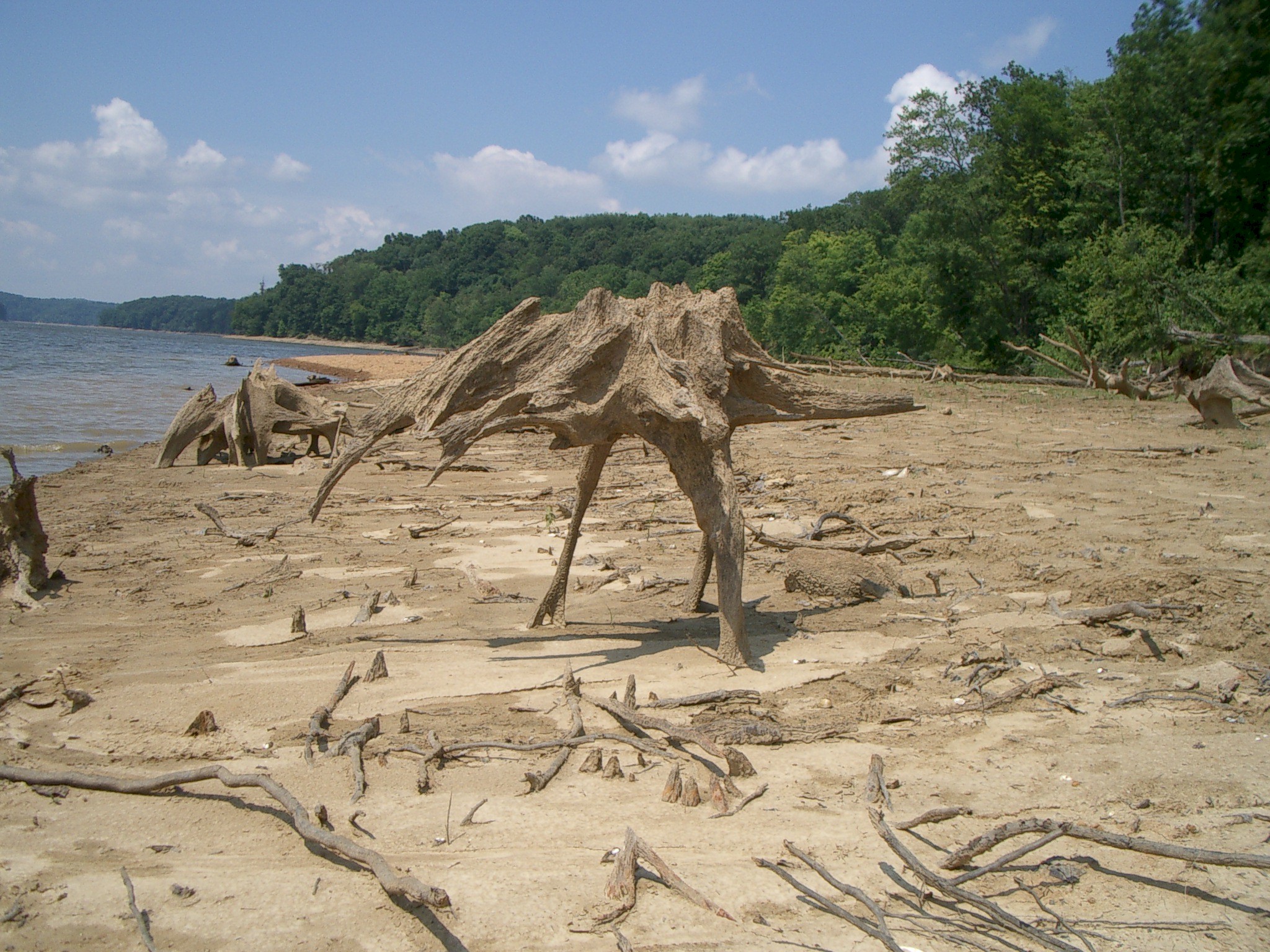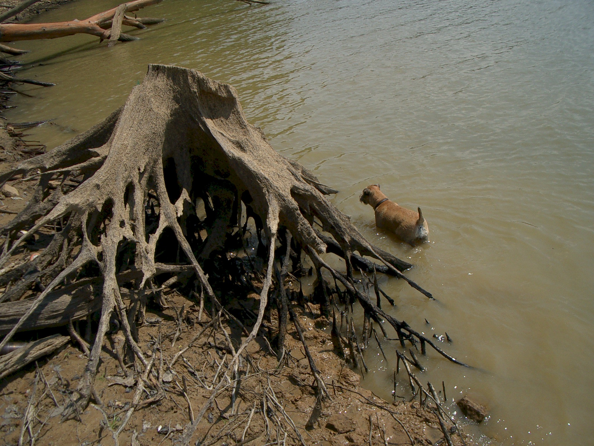 After a rest and a lunch of watermelon, we took another walk to the reservoir.  These pictures have larger images.  The picture with the path is the way to the water.  While not apparent, this is a steep descent.  Very steep.  Exceedingly steep.  Once down there was walked almost to the beach and back.  Grace chased some animal and disappeared for a few minutes.  She was terribly sorry but she reports the animal stuck out its tongue at her.  She had to.  While walking the beach line we spied a number of trees that suggest a significant amount of erosion has occurred.  While on the beach Grace walked in the water while I walked on rocks.  She was cooler than I was.  She still is.
