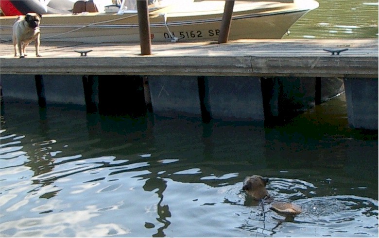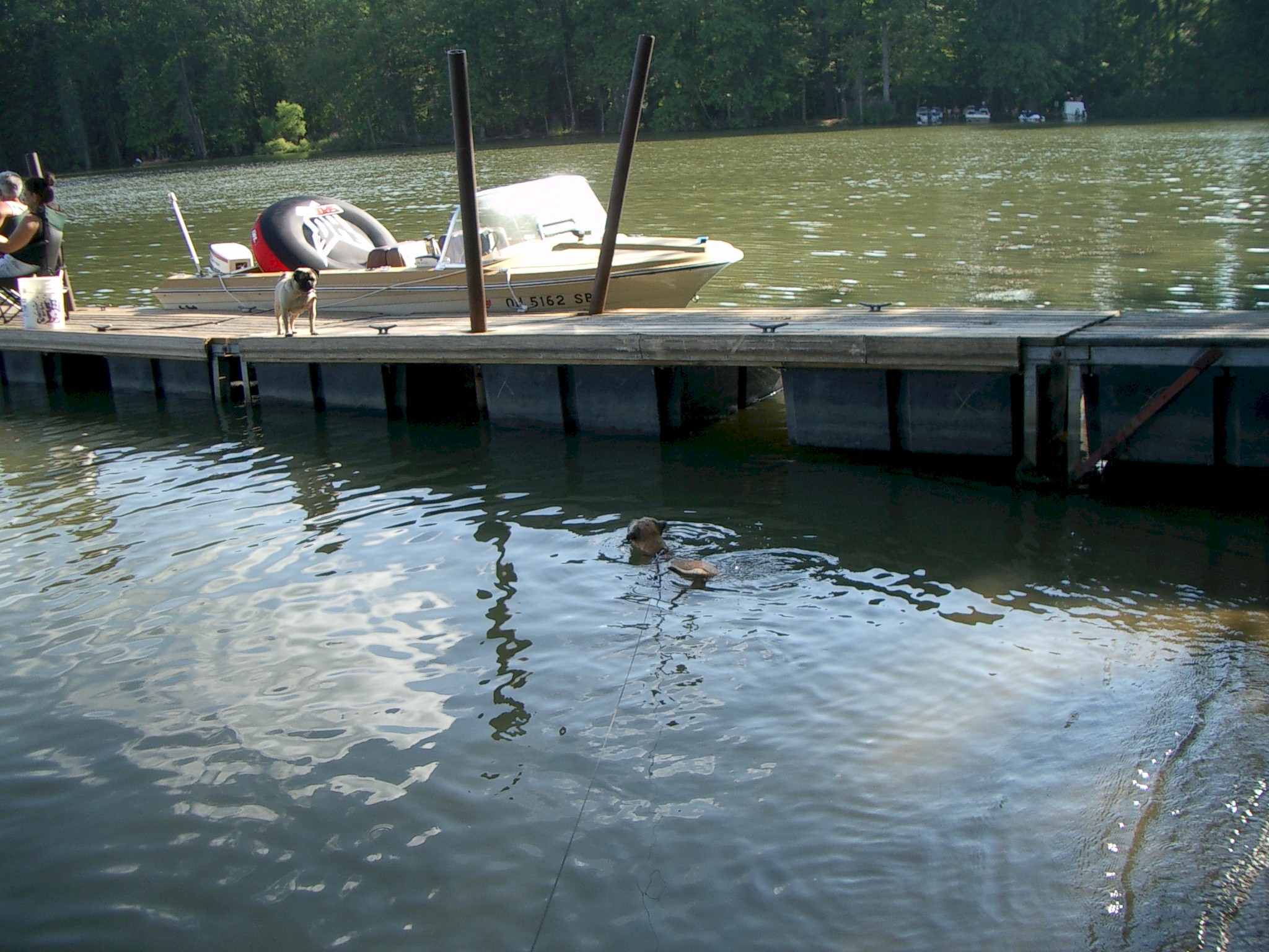 Click for a larger imageClick for a larger imageI took a walk to say hello to our beaver friends.  They weren't home but we made the acquaintance of two turkeys and, I think, a flock of grouse.  If you click on the picture above you will see the one turkey on the left a ways up the path.  We then walked to the boat ramp figuring maybe we'd find Mr. and Mrs. Beaver up there.  There were too many people for beavers to be happy.  Grace did meet Dempsy the deep throated Pug.  It appears she's in love.  As I write this she is being a pain wanting for all the world to go see Dempsy again.  She's going to be a handful now.  I know she was impressed with Dempsy.  Dempsy was on the boat dock.  Gracie was on the boat ramp.  Grace decided she was meeting Dempsy.  She walked down the ramp and did something I've never saw her do before.  She proceeded to swim over to Dempsy.  Grace has never swam in her life.  Ever.  She did to see Dempsy.  Click on the pictures for larger versions.