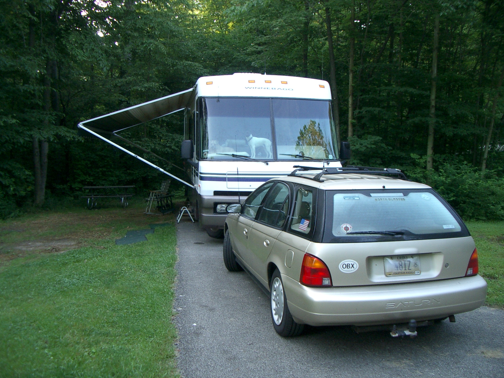 July 1 I was able to discuss the problem with a friend from work. The best solution would be if the caliper is slowly leaking. I drove the car home and returned with Meggie and Persiphony. Megan was able to work the brake pedal and I observed that the caliper was leaking badly. I was able to pinch off the supply line to restore the brakes. We'll be going home with a broken foot. Megan has been studying for the bar and we've not spent much time so it was a nice time with her and Persiph. We stuffed ourselves with mac-n-cheese, cooked hot dogs and marshmallows on the fire, and took very nice walks. Didn't get a lick of studying done but, hey, the time is more important. July 2 We slept in (well, four of us). We took a walk. We came home with absolutely no problem. The motorhome pulled mildly to the left but it there was no issue of control. I was able to price the parts. It is expensive, but not near as expensive as I had thought. For up-to-date park maps and information, check the |
