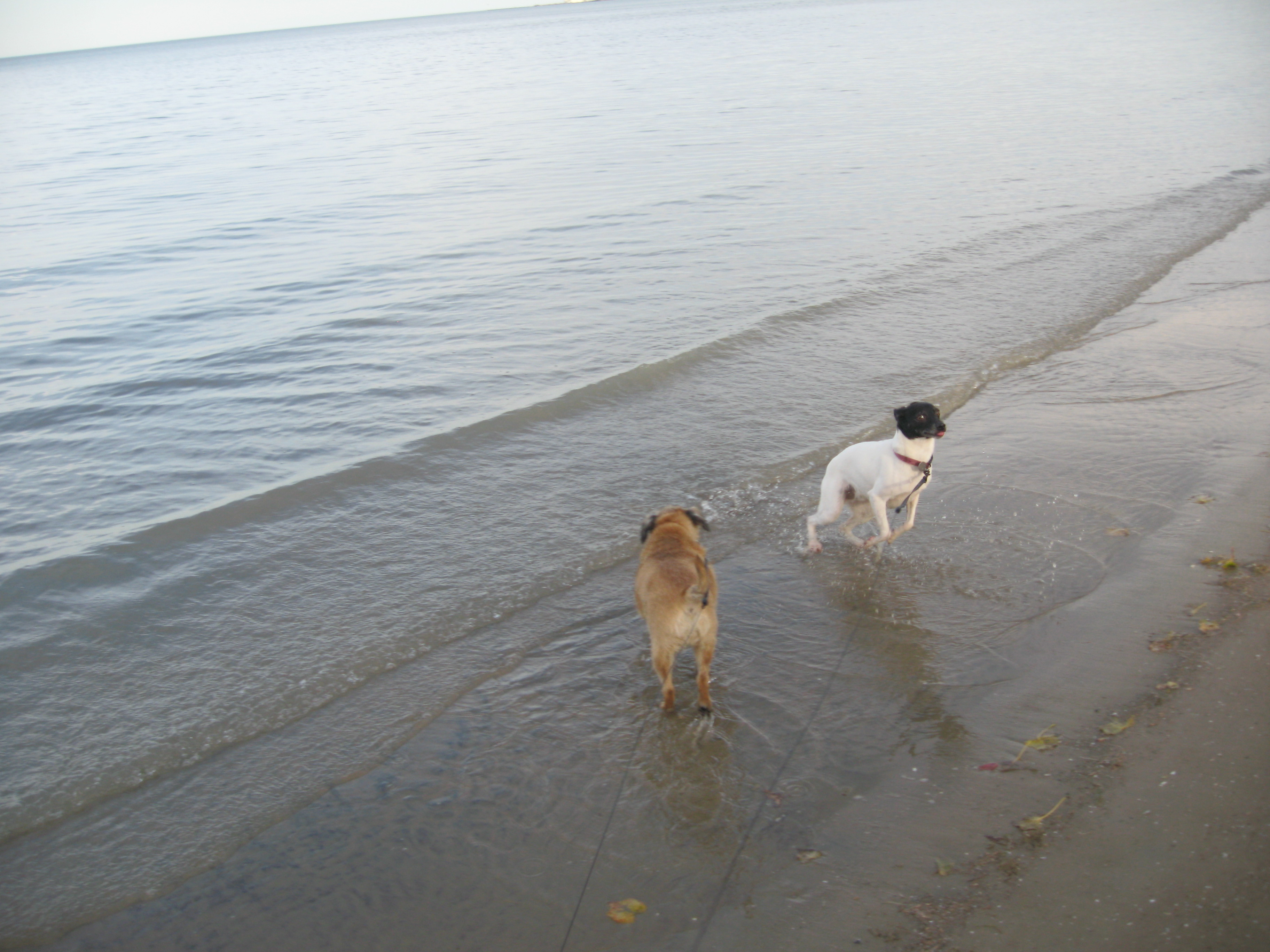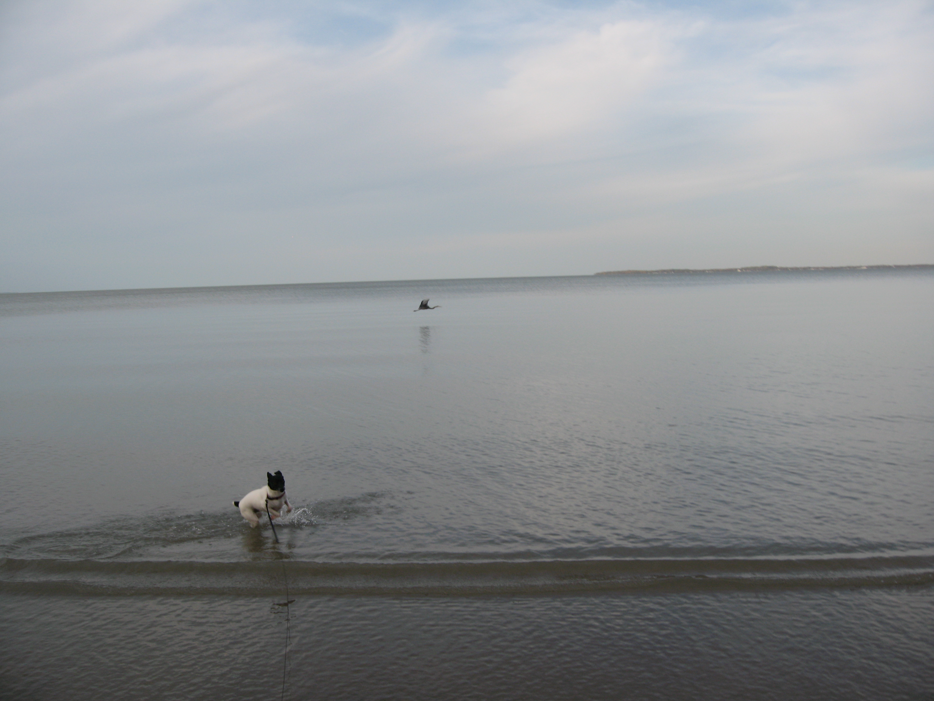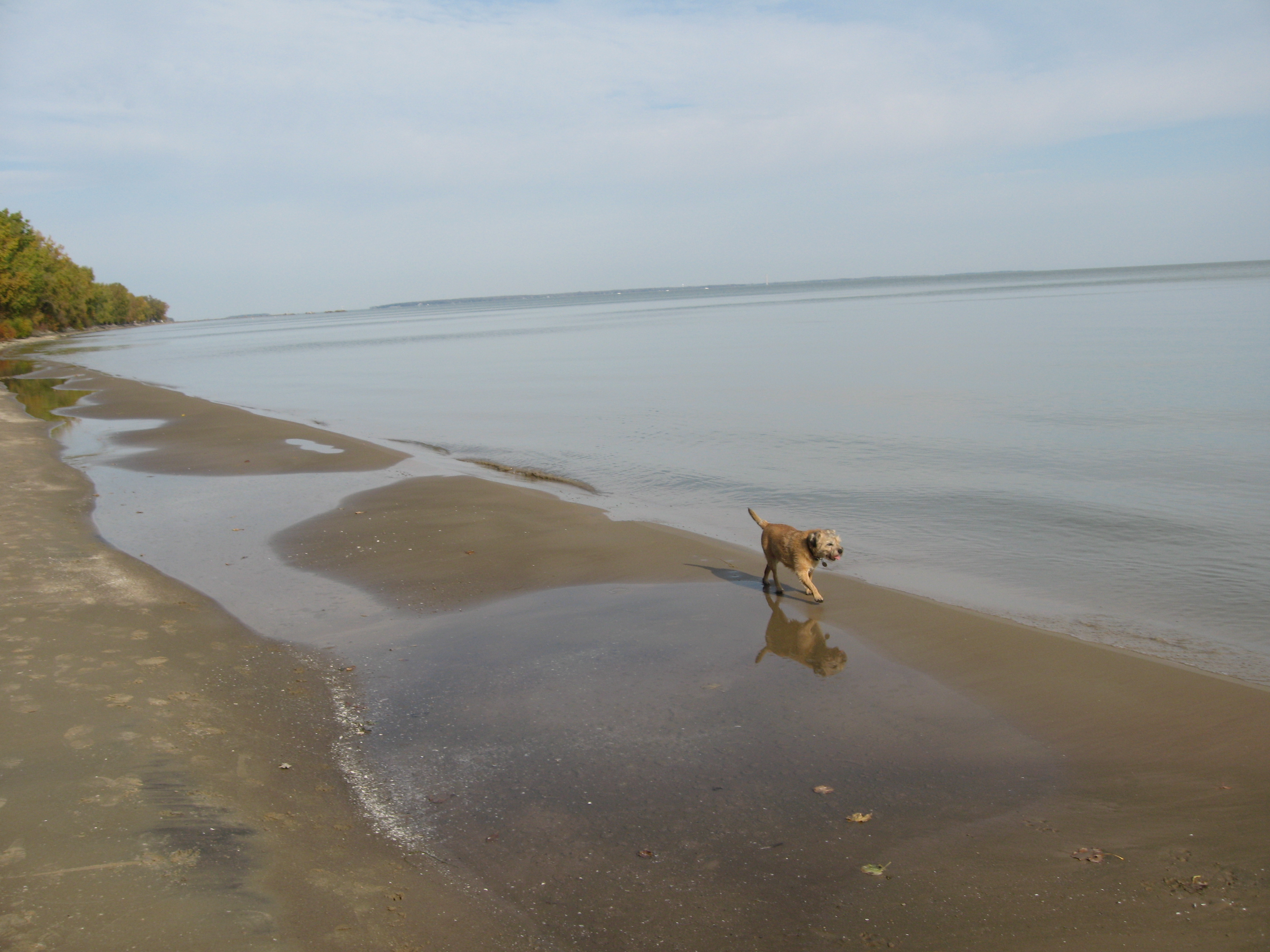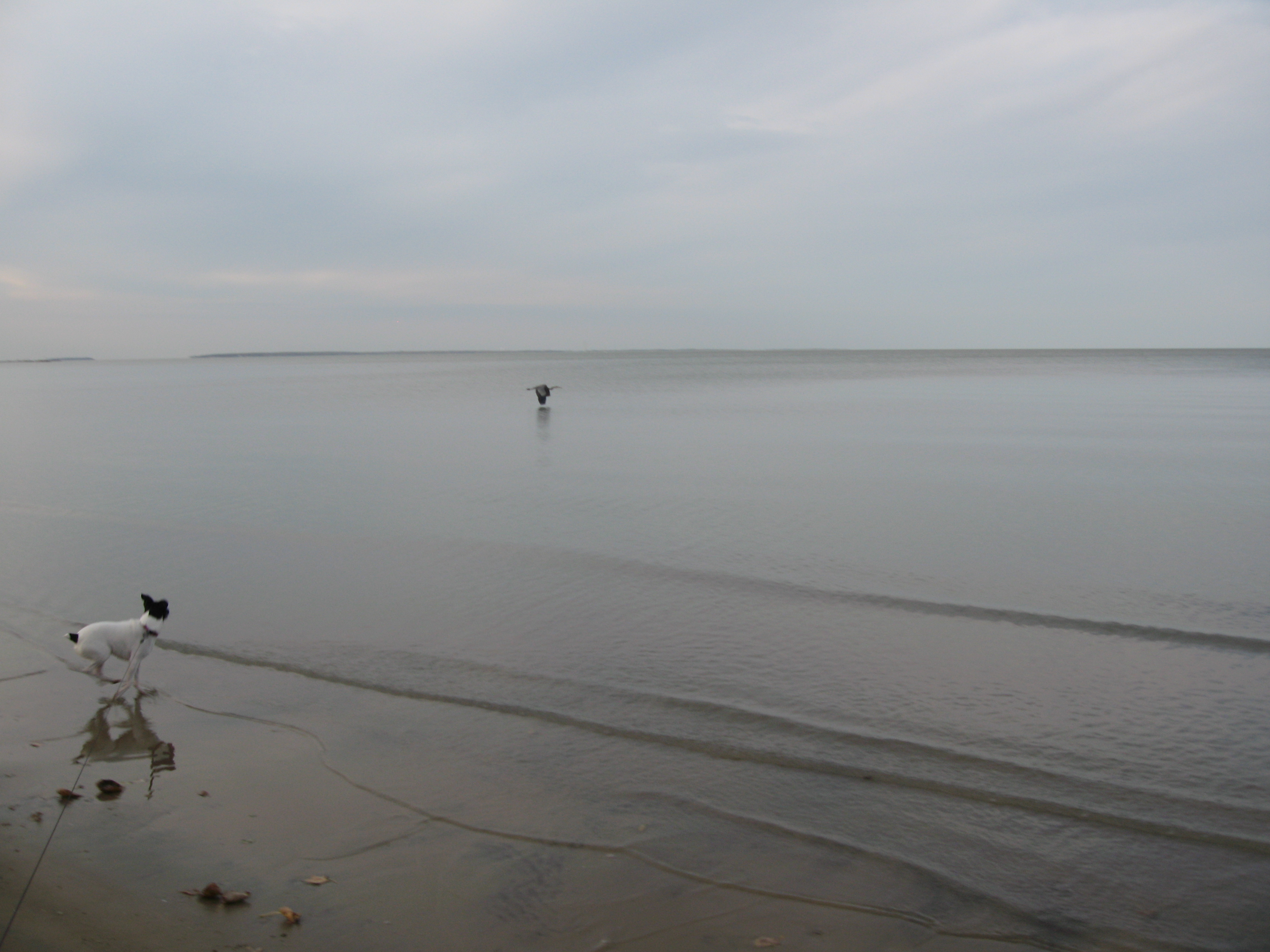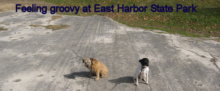 the images for a higher resolution picture October 19, 2009 This is our first trip back to East Harbor since 2007. They recently repaved the whole park and the roads are in excellent condition. They added an all purpose trail to the beach by taking one lane of the inbound road and making it the trail. We took two walks. The first was about two miles through the closed Area C and Red Bird trail to the boat ramp. The second was a five miler that went to the beach. The dogs proved themselves great and fearless hunters. We saw some interesting birds. One is colored exactly like tree bark and flits from low to high on a tree examining the bark for good things to eat. Industrious critters. We also saw robins flocking near food. They particularly liked being on the shore, under a tree, standing in an inch of water. There must have been some water-borne critter that was particularly tasty.
