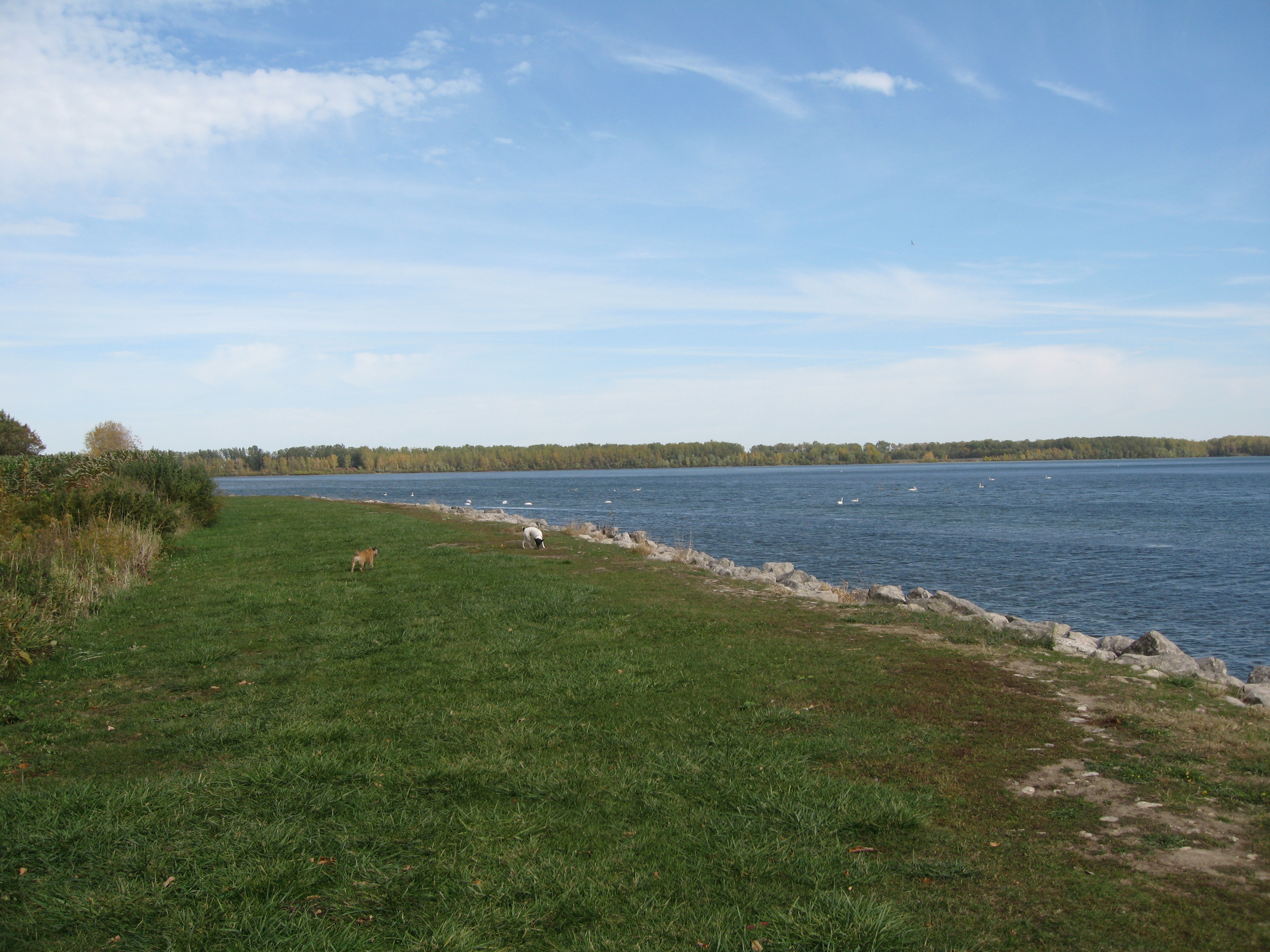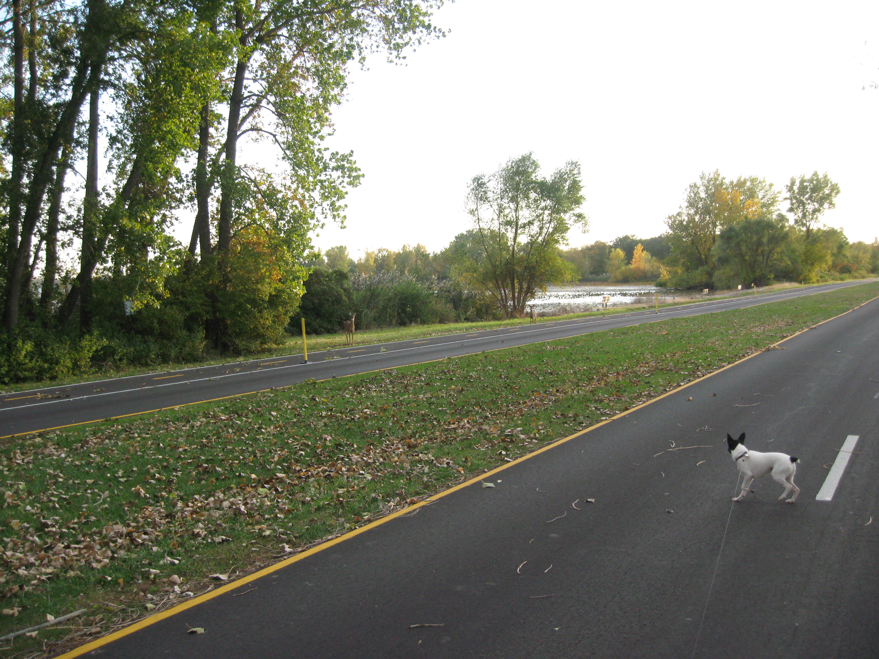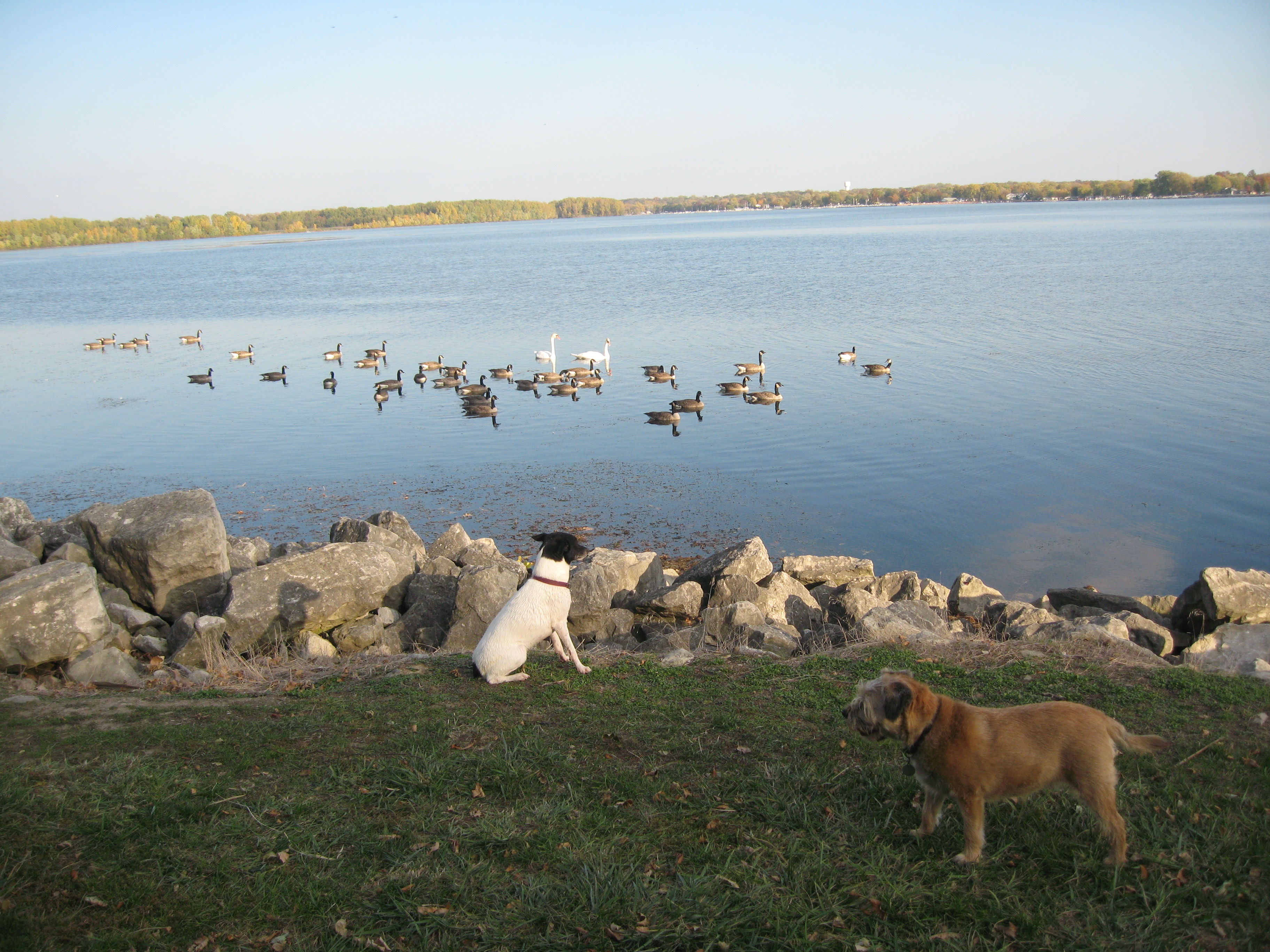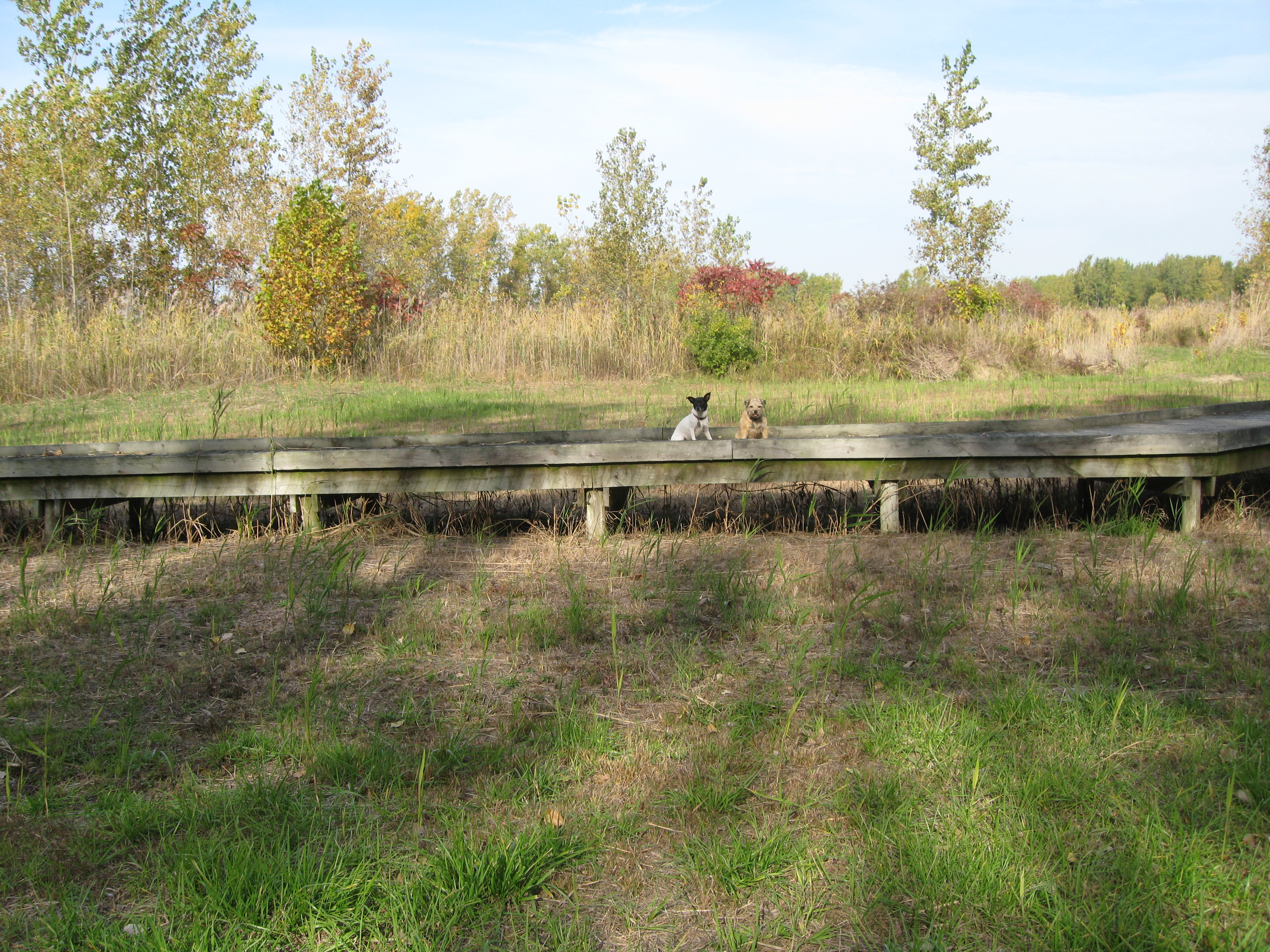 the images for a higher resolution picture October 19, 2009 This is our first trip back to East Harbor since 2007. They recently repaved the whole park and the roads are in excellent condition. They added an all purpose trail to the beach by taking one lane of the inbound road and making it the trail. We took two walks. The first was about two miles through the closed Area C and Red Bird trail to the boat ramp. The second was a five miler that went to the beach. The dogs proved themselves great and fearless hunters. We saw some interesting birds. One is colored exactly like tree bark and flits from low to high on a tree examining the bark for good things to eat. Industrious critters. We also saw robins flocking near food. They particularly liked being on the shore, under a tree, standing in an inch of water. There must have been some water-borne critter that was particularly tasty.