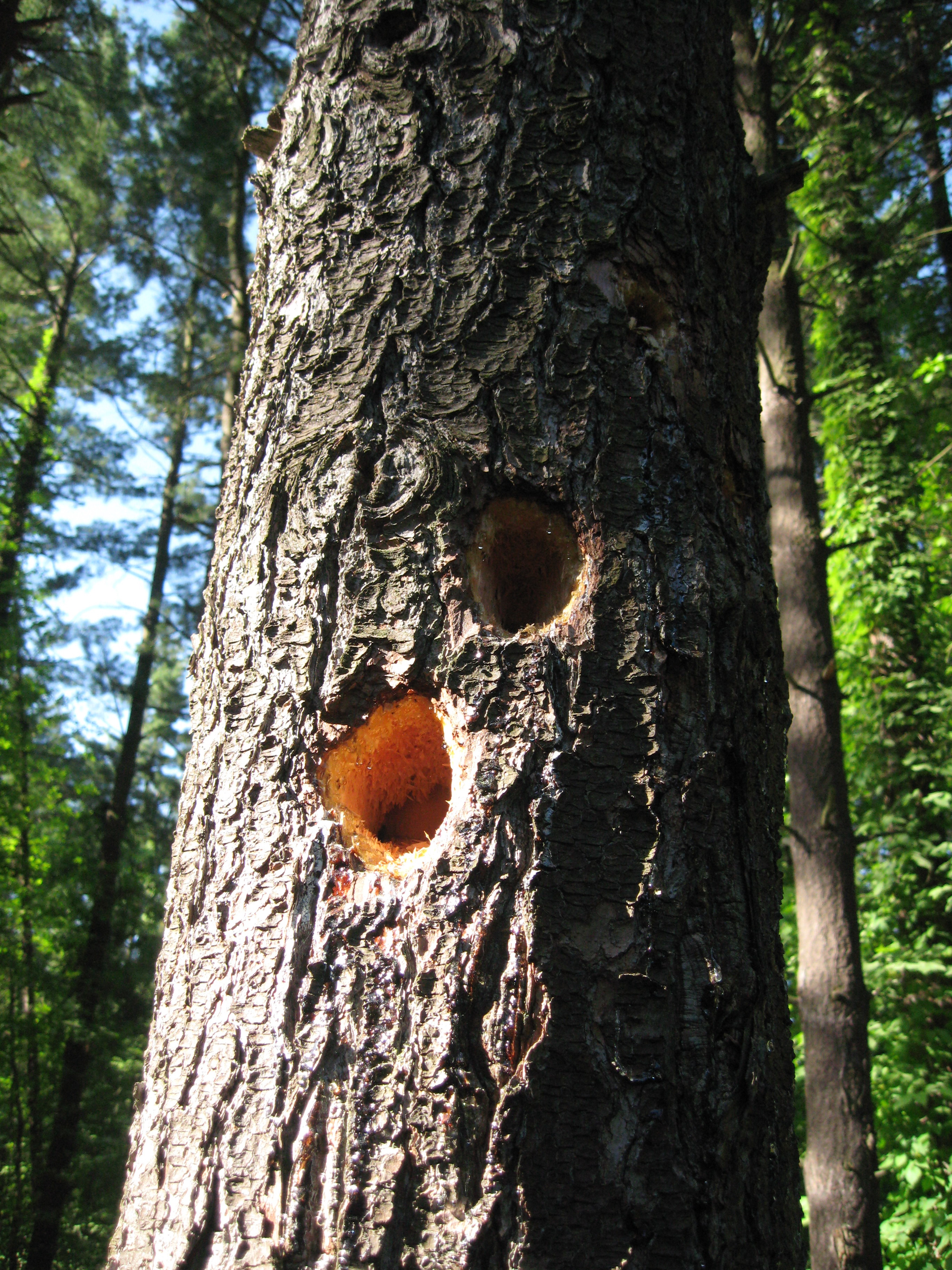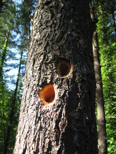 There are quite a number of pine trees that have holes bored in them.  I have yet to see the culprit.  A very few are bored by ants.  I expect a woodpecker is making the majority of the holes.