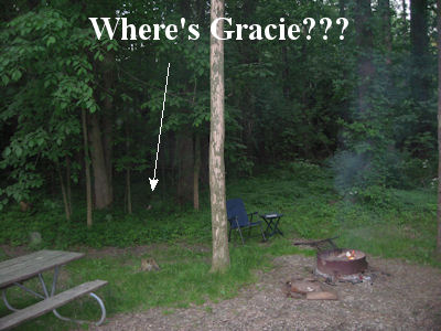That's one of them.  What of Grace?  Well, Grace took a flashlight to find.  She was right behind me, about fifteen feet into the woods.  She found a nice comfy and cool spot amoung the groundcover.  Click on the picture for a larger version.