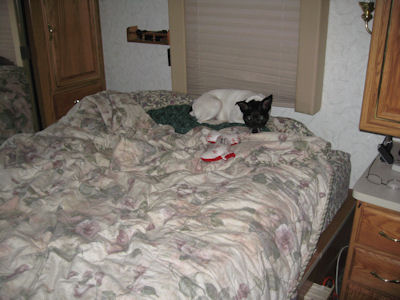 I'm sitting in front of my fire reading my Kindle (Hans Kung:  What I Believe).  Because the park is just about empty, there is no need for me to tether the dogs.  I didn't realize how involved I'd get in the book and about an hour later I look around.  Uh oh!  No dogs.  "Grace!"  "Moose!"  Nothing!  I surmise they went inside and went to bed.  They're like that.  Bed time is bed time.  Inside, on the bed, I find Moose: