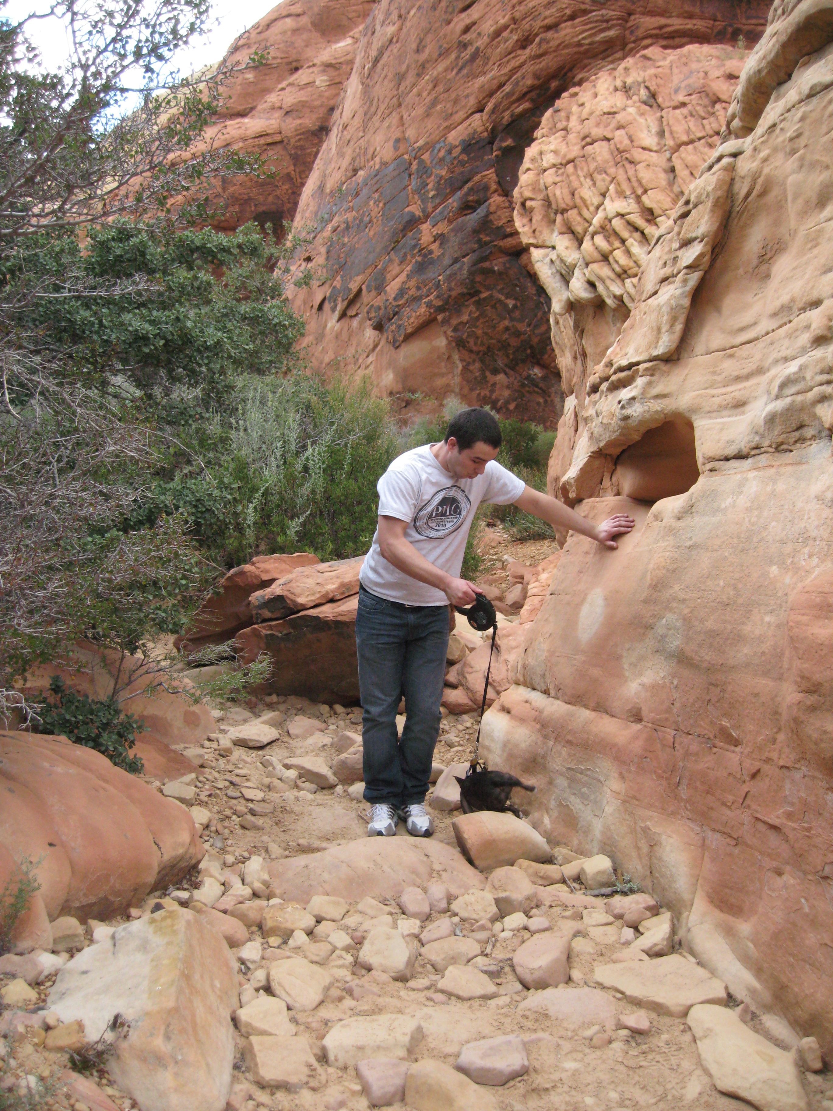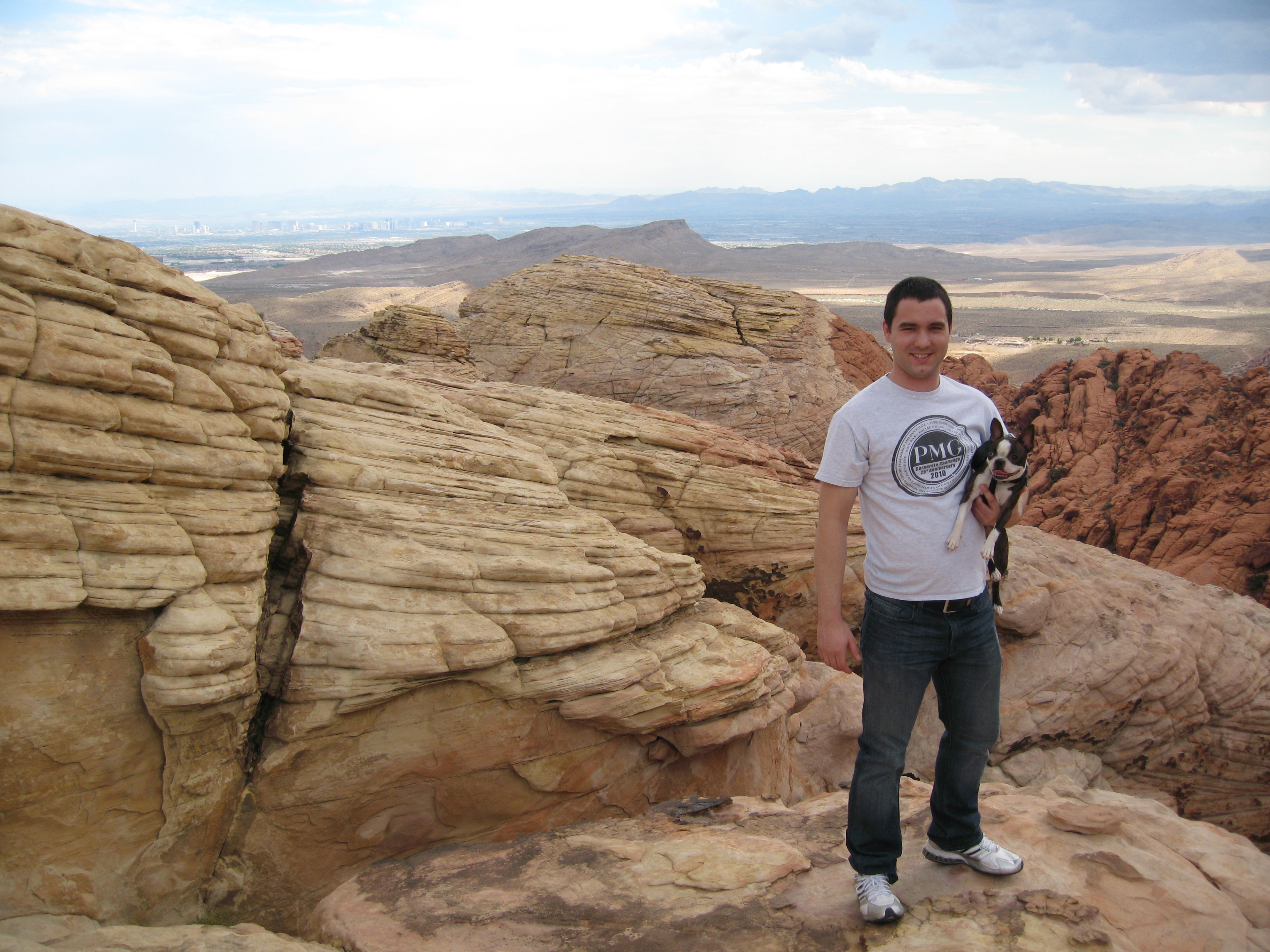 October 3, 2011We started with breakfast at the I-Hop by his house. We then went to his house and I caught up with Bonita. We had much to discuss. B, Matt and I headed to the Red Rock National Conservation Area and we hiked the Calico Tank Trail. This is an intermediate trail, about 1.2 miles long with an elevation change of about 400 feet. Near the end is a large rock bowl, about three-quarters of an acre, that normally holds water. It is important to the local animals. It had rained, and it drizzled on us some. There were many tiny toads, about half the size of your little finger nail. At the far end of the trail is an overlook that looks down on Las Vegas. Pretty cool. We took a drive to the Lovell Canyon area. The amount of hiking available is amazing. We came back, cleaned up, took a short nap. We headed off to The Social Club for an amazing steak dinner and then went to see "The Rat Pack Returns". It is a tribute show to the original Rat Pack, Dean Martin, Frank Sinatra, Sammy Davis Jr. and Joey Bishop. A great show. We went to The Sugar Shack for dessert. That was decadent, to say the least. We walked a number of casinos. Here's red rock.