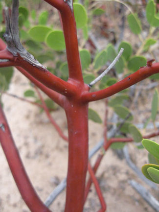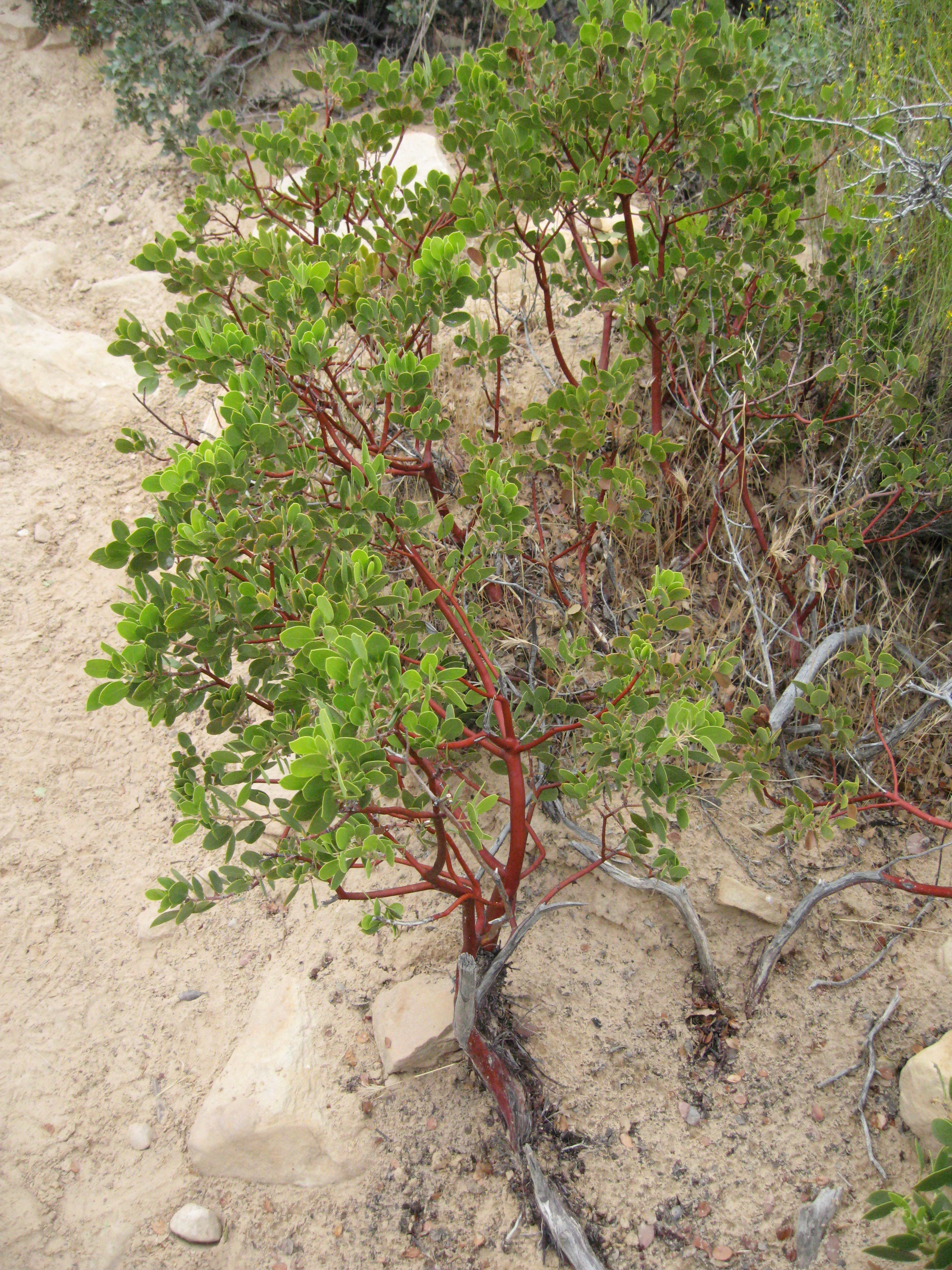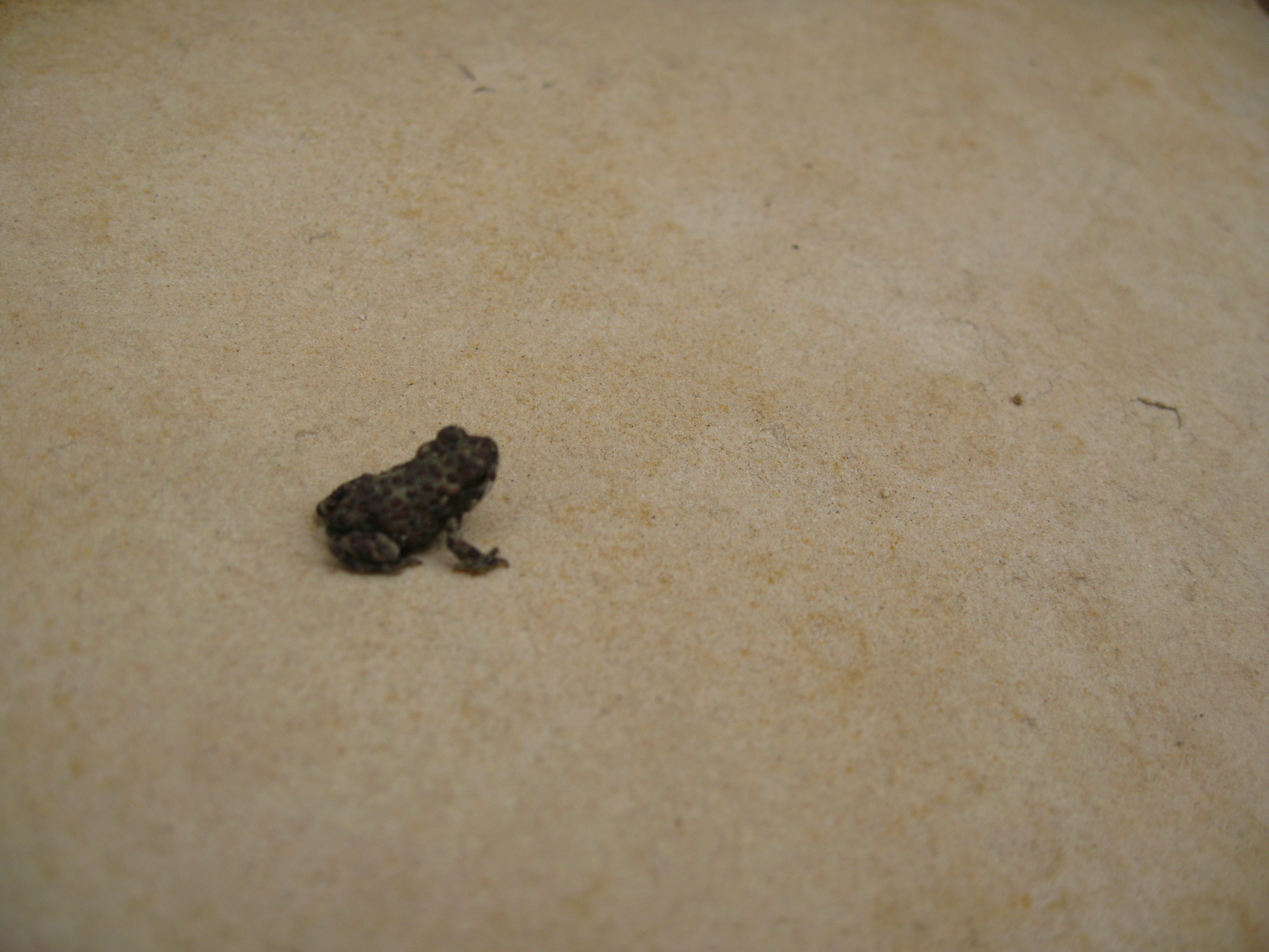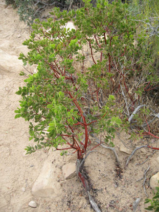 This is an example of a tree that appears to be sprouting from the old, gnarled remains of another. The new growth looks like it has no bark. The wood is very smooth. It appears to be a "Manzanita". These are the little toads, about half the size of the nail on your small finger: