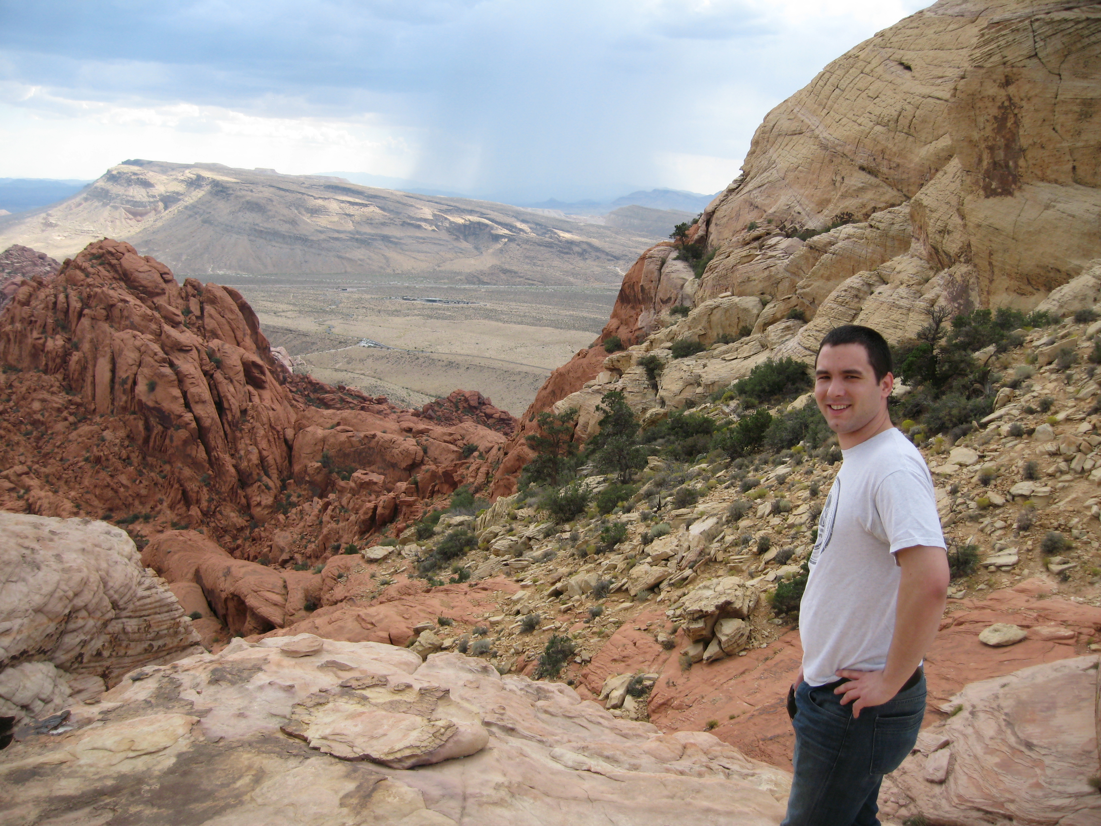 Here we are hiking back down. Look at the rain cloud in the distance.