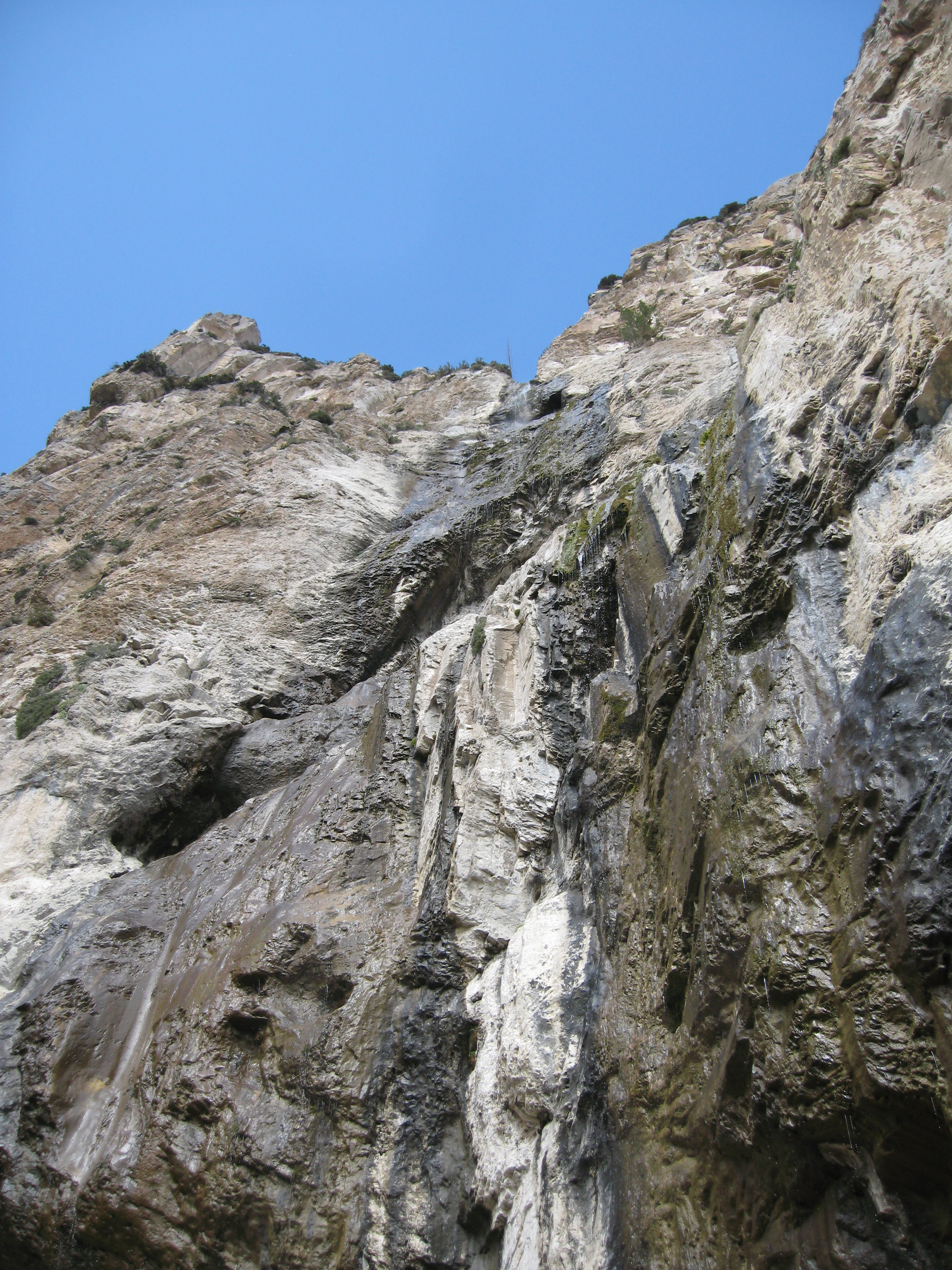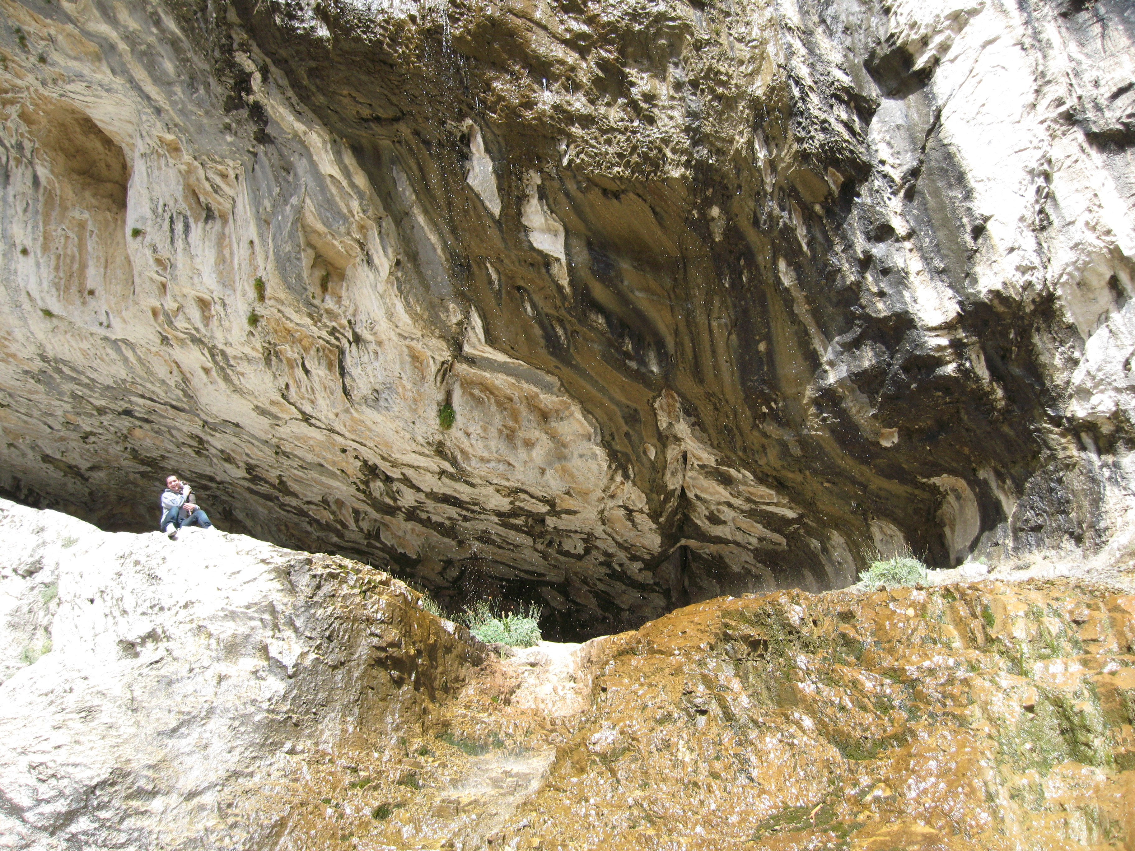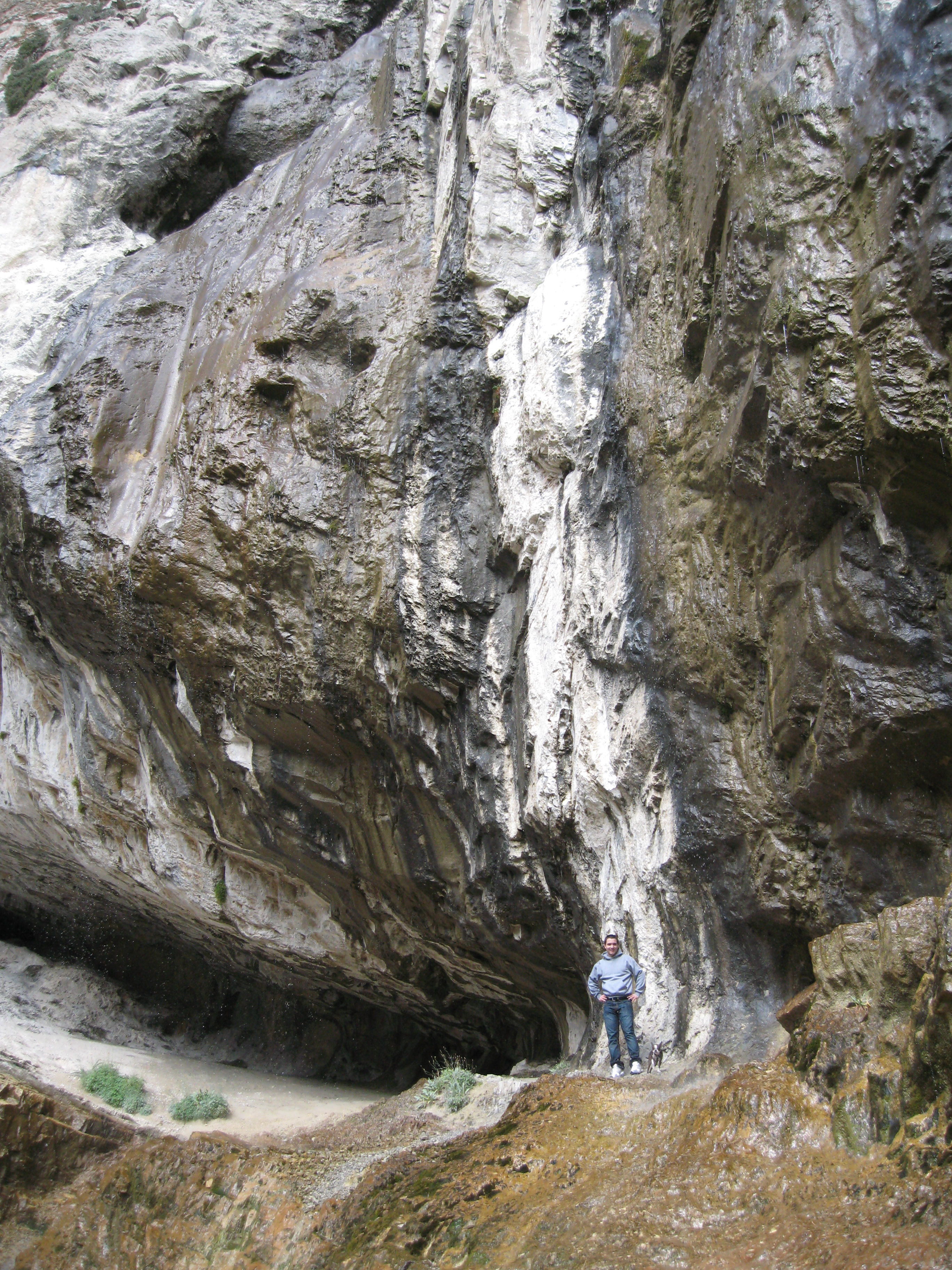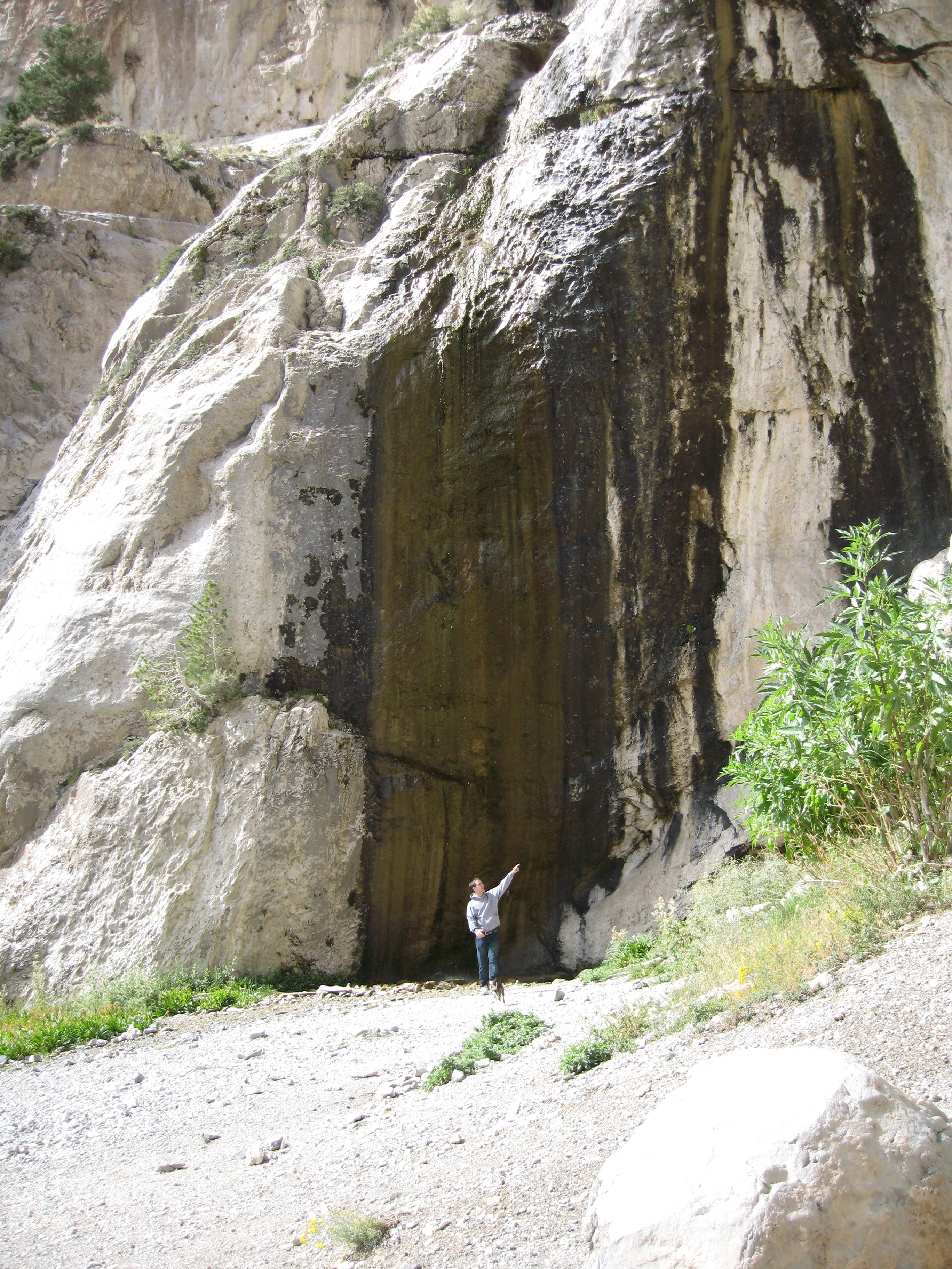 Looking out from the bottom of the falls. Note the patches of snow above Matthew. It is October. Those have been there all summer.