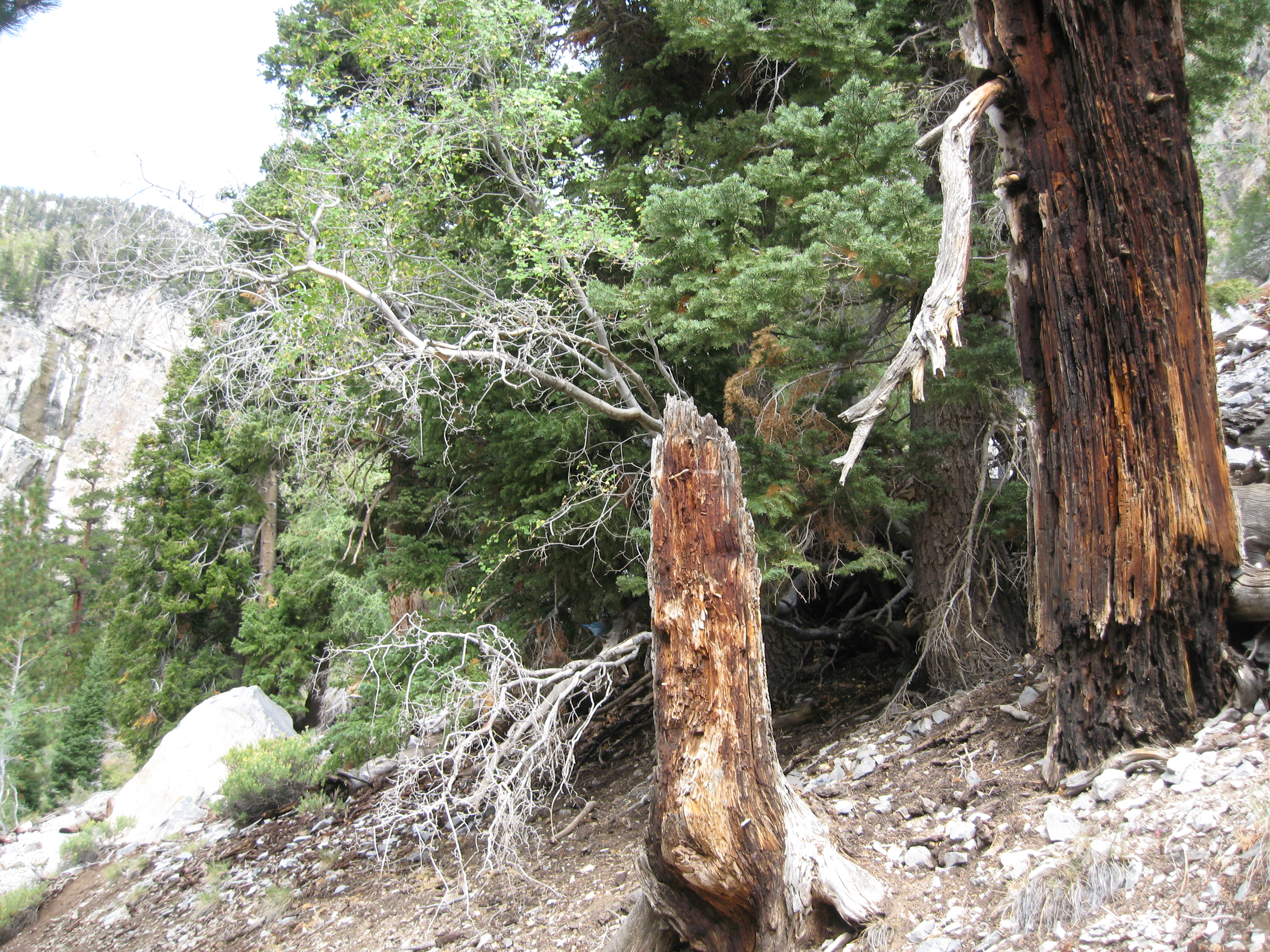 October 4, 2011I-Hop started our day, again. Fuel for the walk. We went for a long drive in the Mount Charleston area and did a hike up to Mary Jane Falls. Afterward stopped at Matt's house, dropped off B and returned to my hotel room for a nap. On our way up to the falls, we chanced upon a Stellar's Jay. This bird is kind of like a blue jay, but with a lot more attitude. It was not happy at all that we were walking about a tree under which it was eating. This isn't a great shot of the bird. Here is a short movie.
