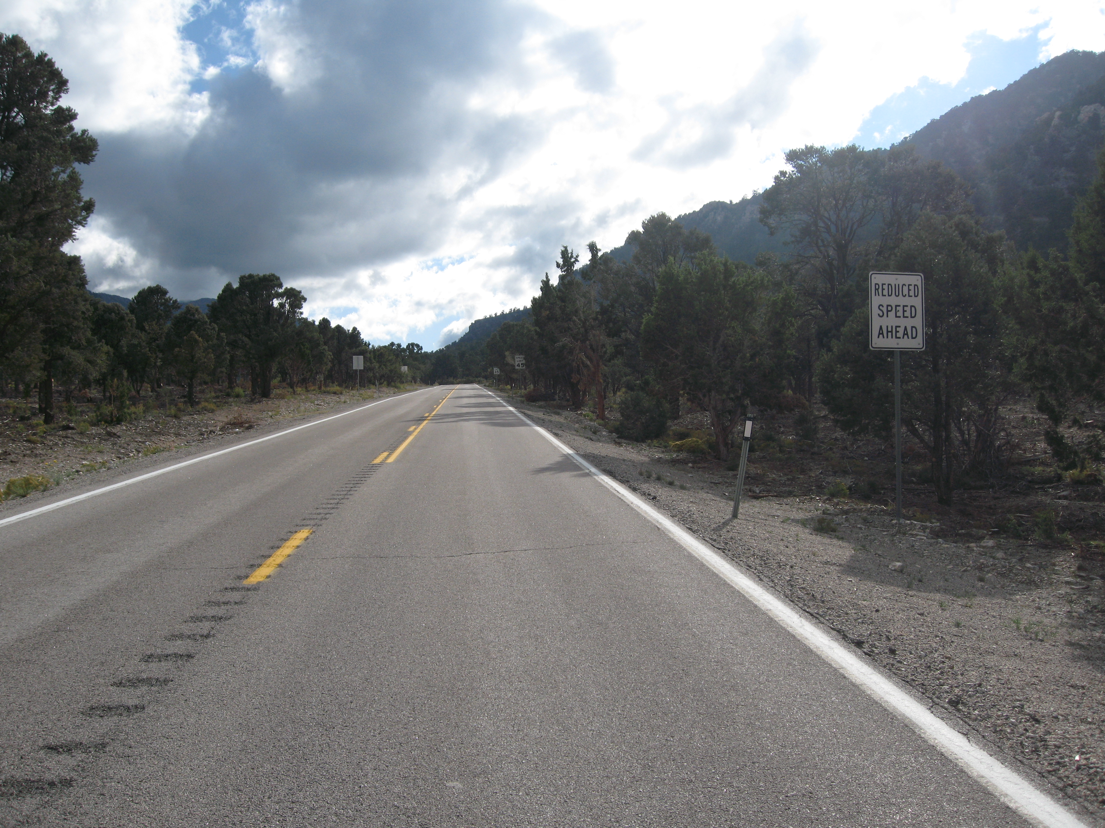 Three signs: REDUCE SPEED AHEAD, 45 MPH and 35 MPH in a few hundred feet