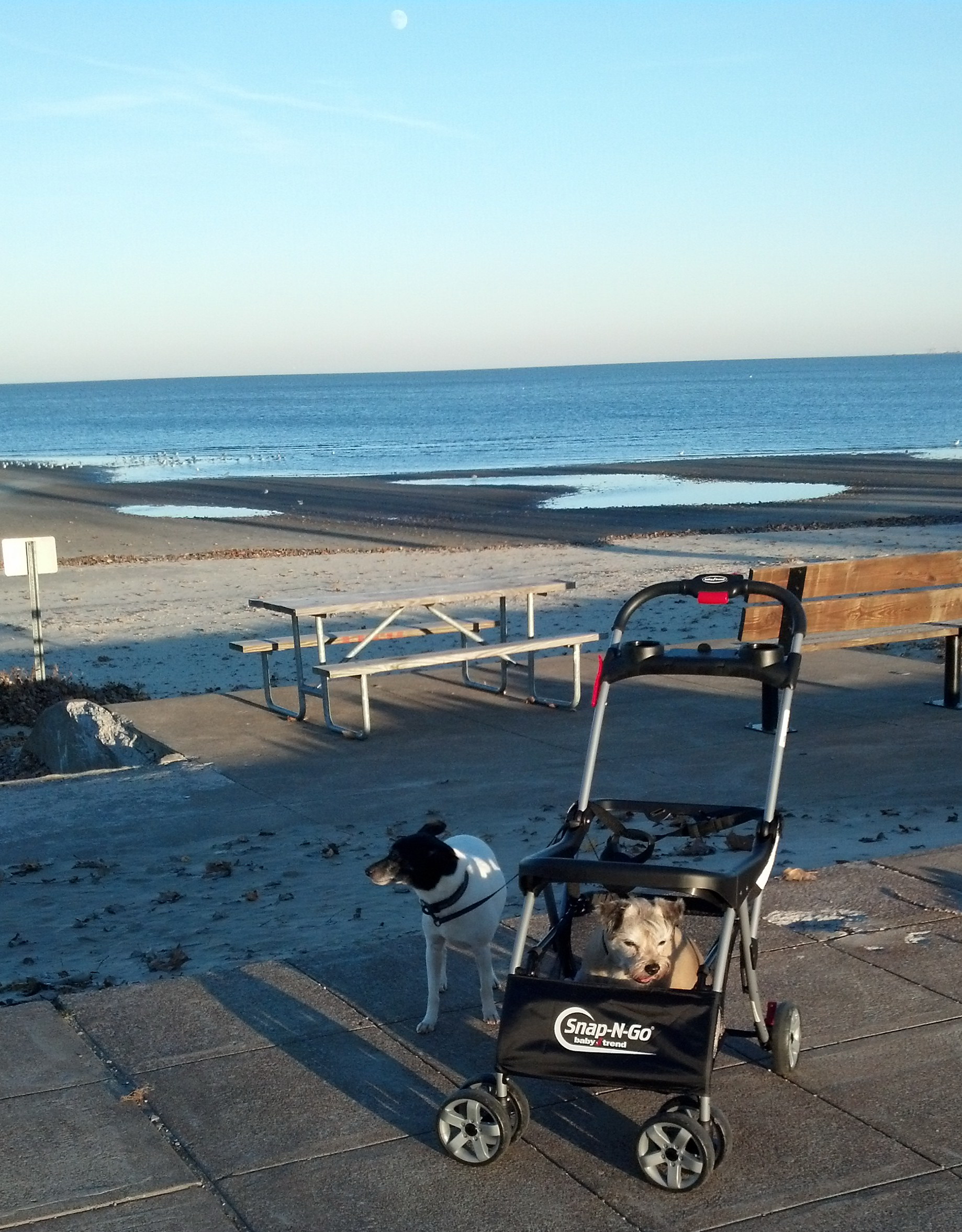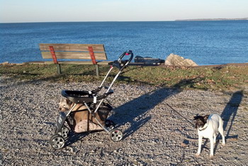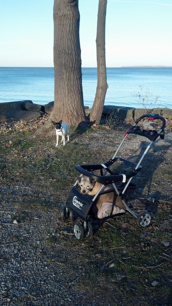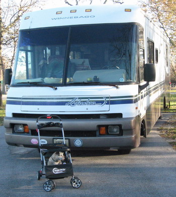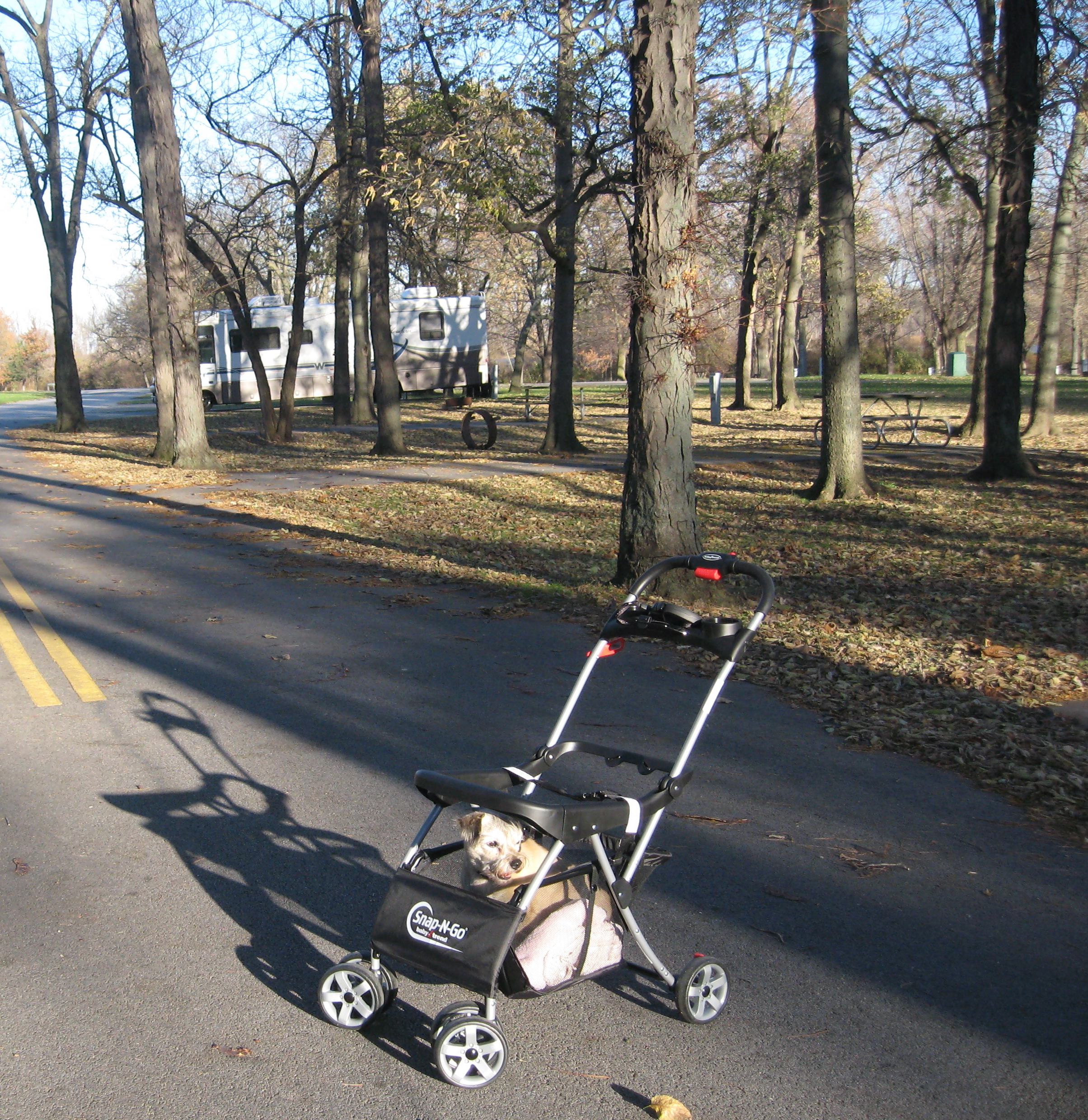 I have a Friday, Saturday and Sunday off so off we go, out on Thursday! And it is a BEAUTIFUL Thursday. Warm temperatures and with perfectly clear weather I am really surprised we are the only ones in the park. GRACIE HAS NEW WHEELS! Grace turned eleven yesterday and I bought her a new set of wheels. Taking her out for even a quarter mile is a long and tedious process. She walks super slow. Even after a quarter mile she hurts. So I bought her a new set of wheels. Rather than wait back at the motorhome, she was out with us. Worked great! She did five miles today and twenty-one miles this trip!