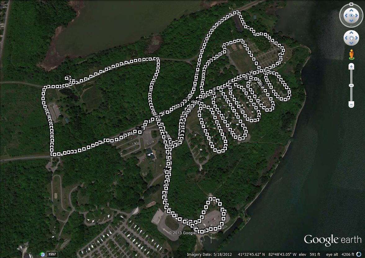 Here is our am walk. When we started walking down the beach I had to leave Grace's geriatric stroller behind and that part of the walk took as much time as the rest of the walk and thensome. I would like to walk the loop farther down the beach and then on the roads back to the camp. Grace will have to stay home for that one. Here's our pm walk: