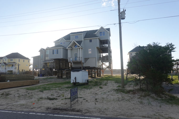 Last month I included a couple of pictures of a home on Ocean View drive that was moved about fifty feet. Ocean View has a HORRIBLE problem with ocean over wash during storms. Here it is a month later. What is that I hear? Is that a contractor's voice? Sounds like an echo! Sounds like, "It'll be done in a month!" Weird. I hear it but see no contractor. Just like at my place. They are really great guys but you never can rely on any of them. There is new wood so they must be planting it there. Contractors arrived later in the week: They are planting it right there!