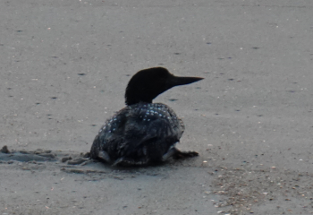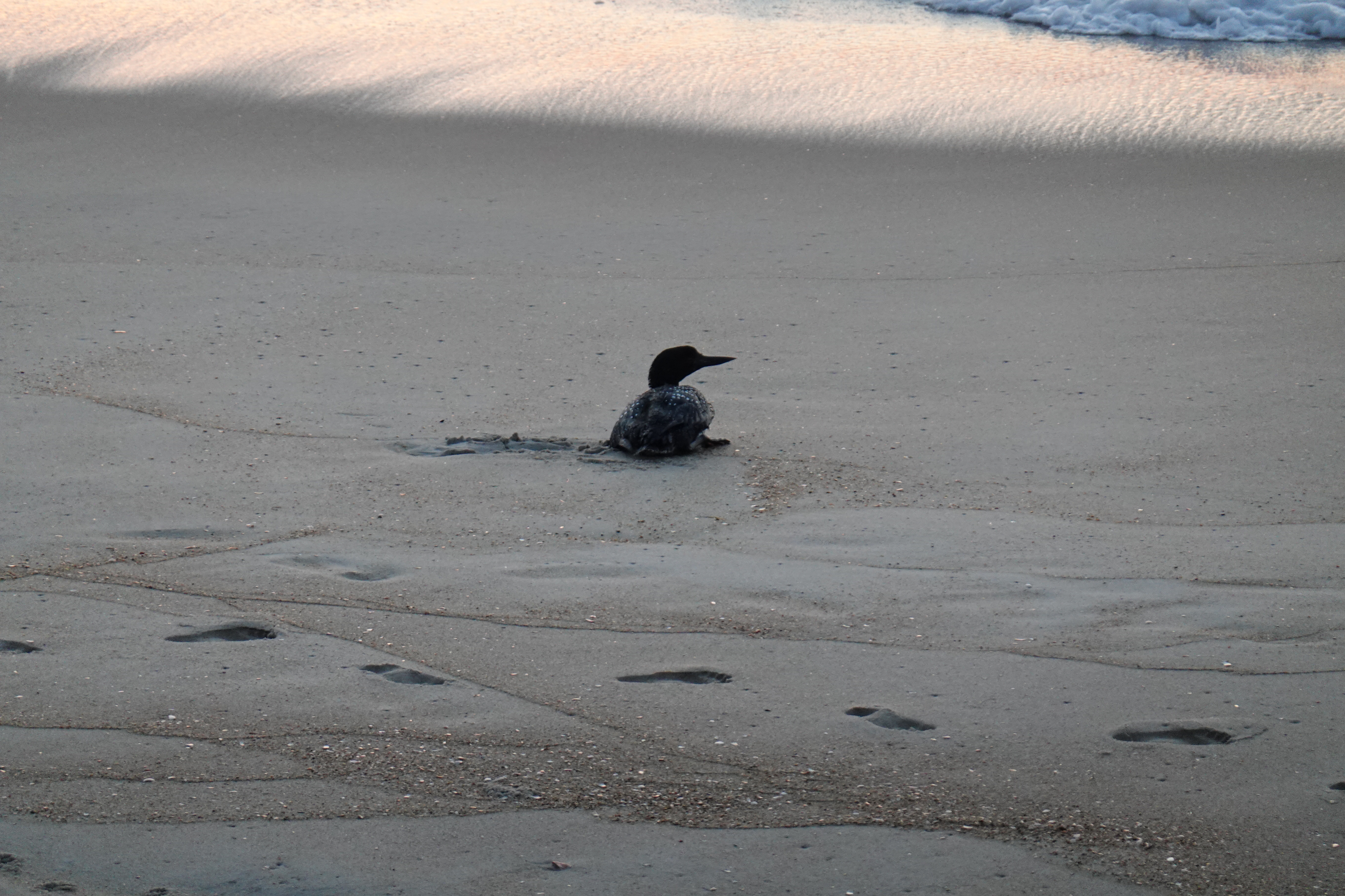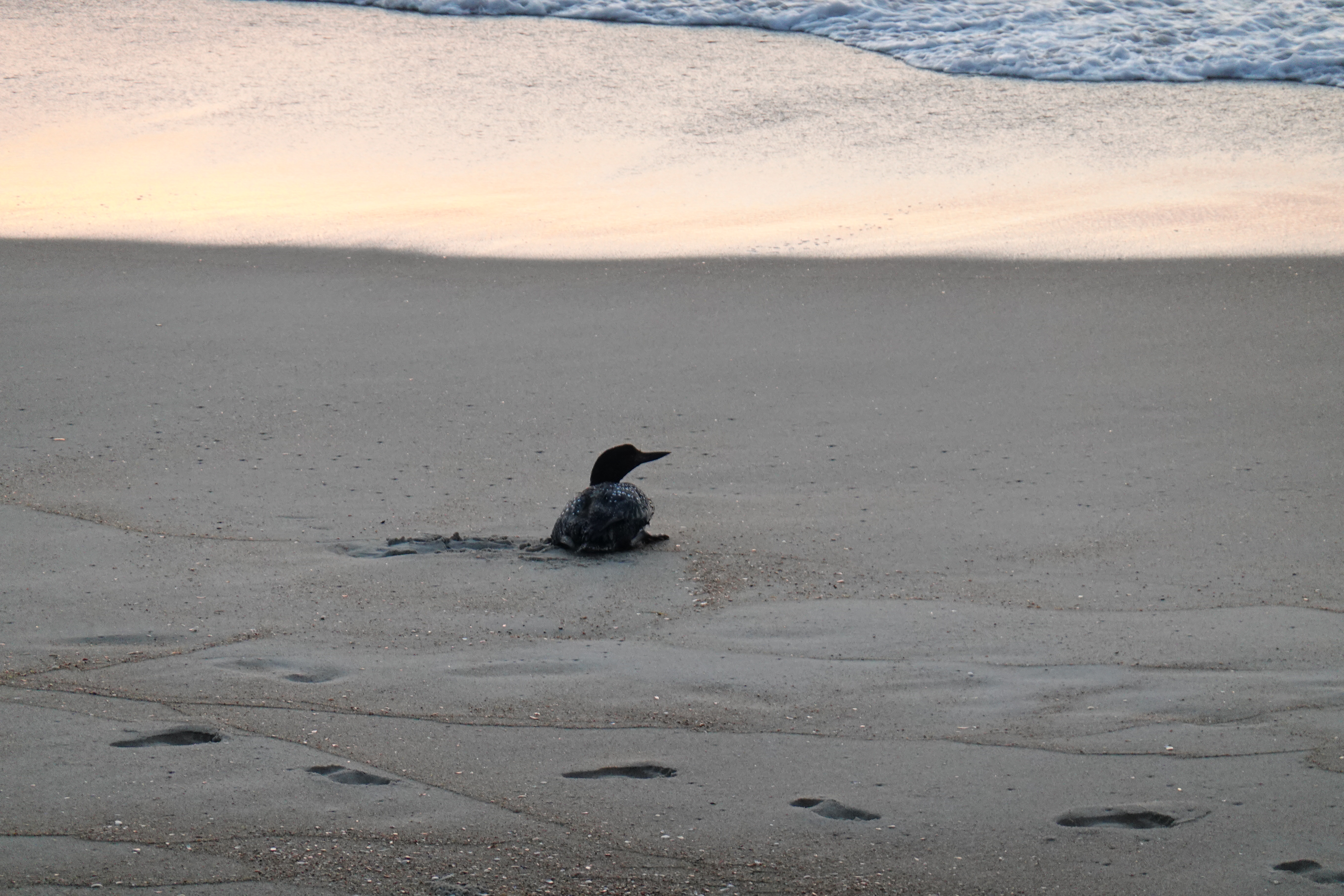 Saw my first loon! A loon is a bird that migrates from Canada to the Gulf of Mexico. They rest on our beaches. A loon cannot walk on land and appears injured. It cannot take off from land. This on is before dawn. It was MUCH darker than it appears here.