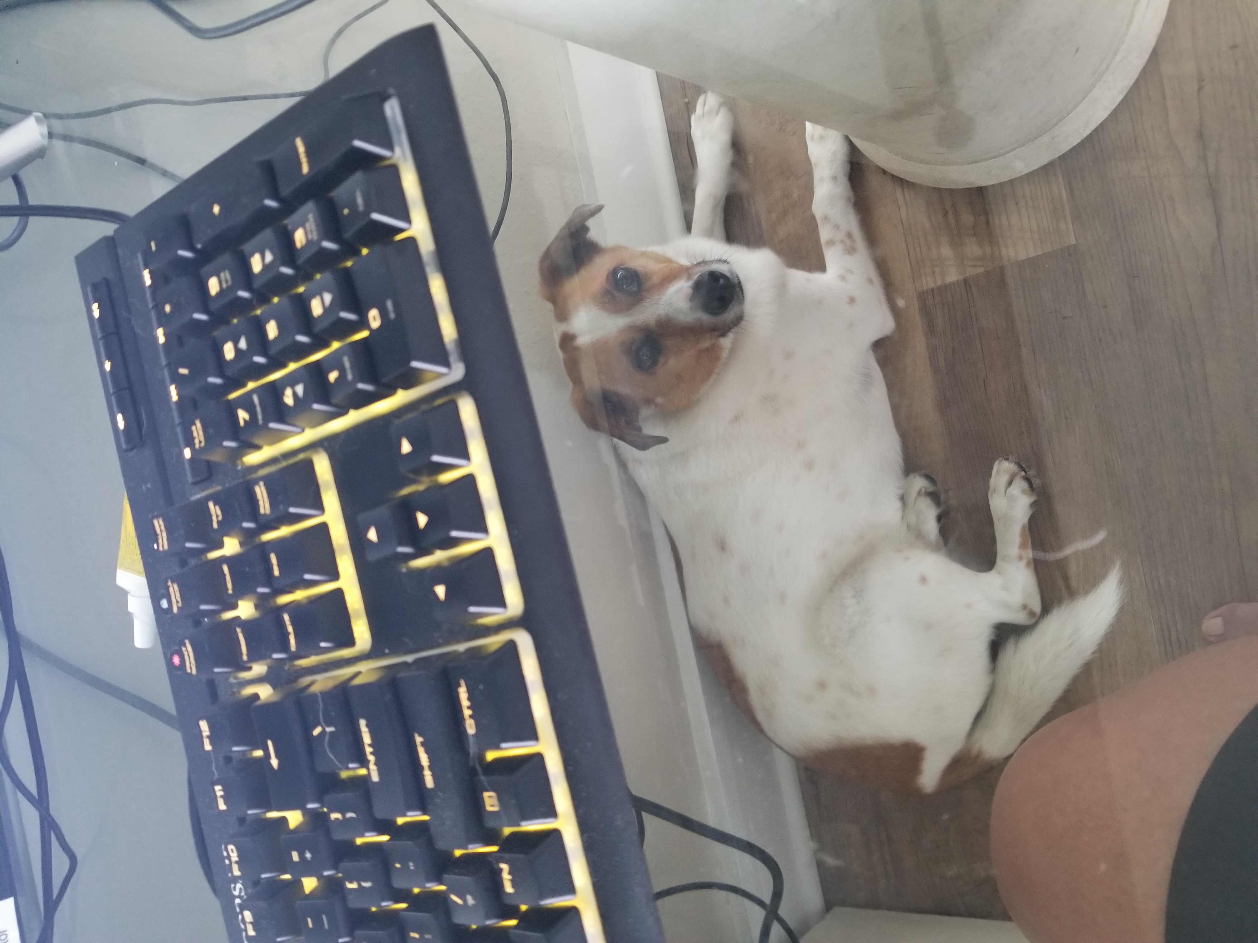 Toodles has figured out that he can lie under my glass desk and stare up at me while I am working.