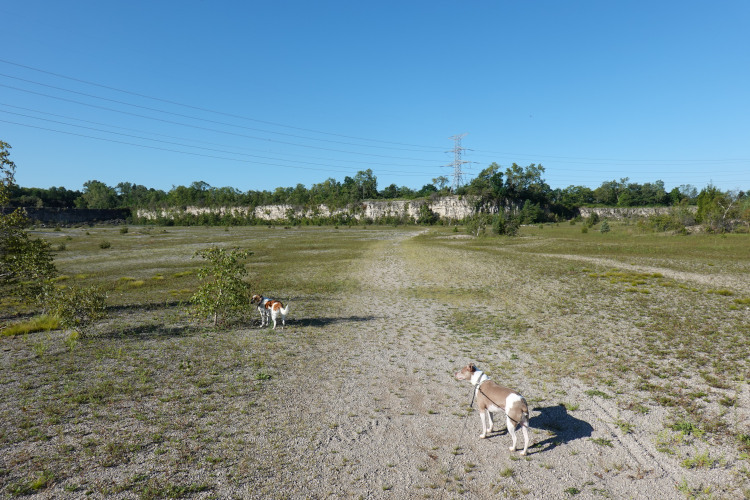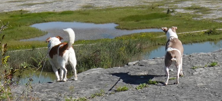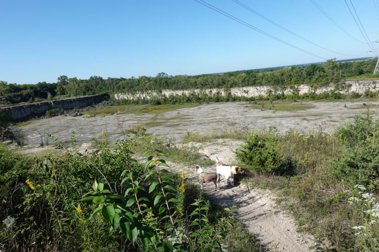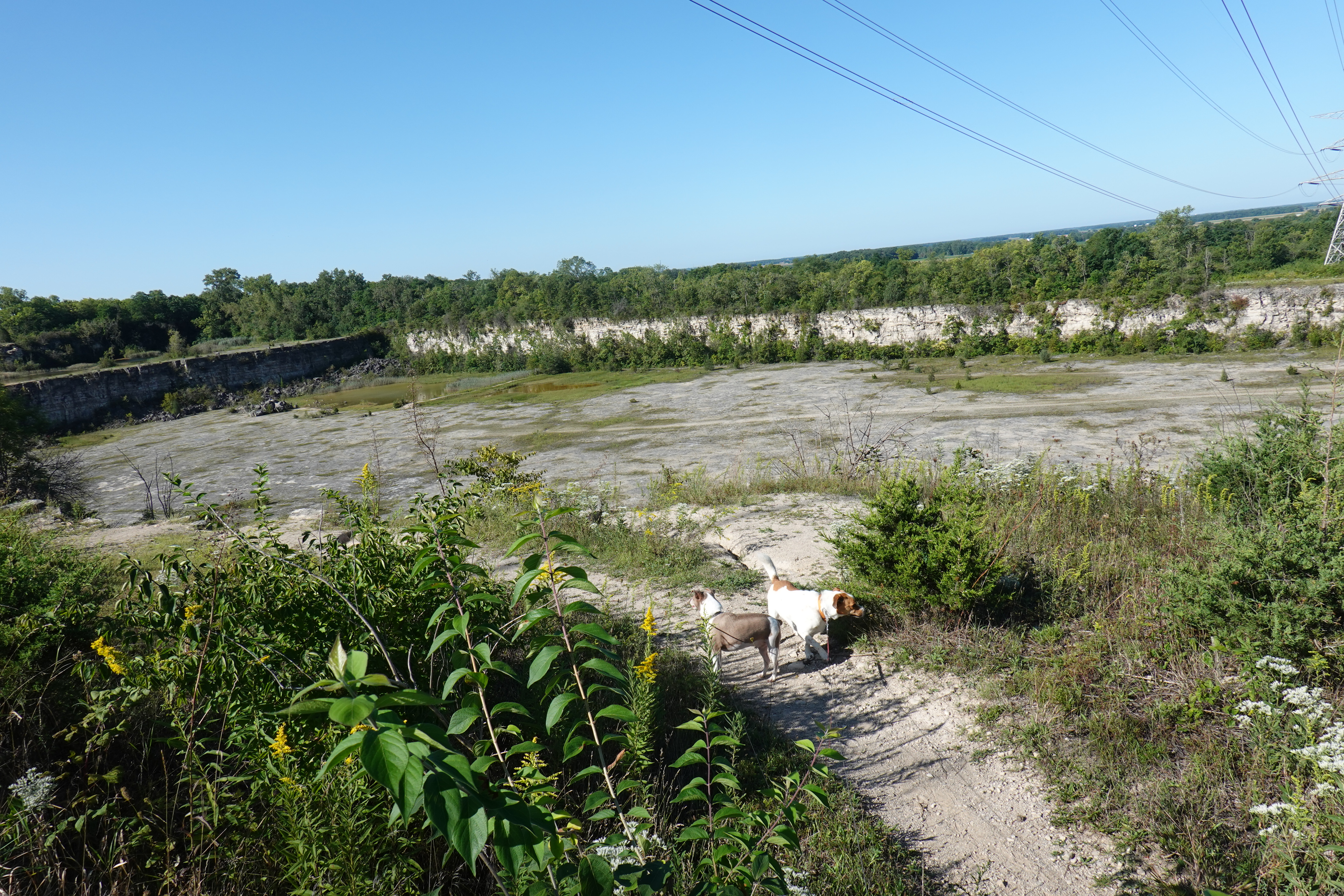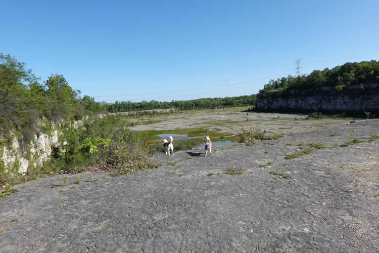 for a higher resolution picture This is our first "Adventure". The idea is to move from spot to spot and discover neat things. And we did! Sheldon Marsh State Nature Preserve Our first stop was Sheldon Marsh where we learned that State Nature Preserves pretty much do not allow dogs. Most are shut off from dogs. Some have a short trail or two where dogs are allowed. In general, no dogs at State Nature Preserves. Castilia Quarry Reservation of the Erie County Metroparks This is REALLY cool and well worth a stop. This is an old rock quarry. There are paths into the quarry, around the outside and some in other areas. This place is both geologically cool and the vistas are pretty amazing. There are no real difficult grades. The whole park appears to be bicycle friendly. We did about four miles here. This is from inside the quarry: From the rim trail. What you don't see above is that they are both at a seventy-five foot shear drop. They just walk right up there without any thought of falling.