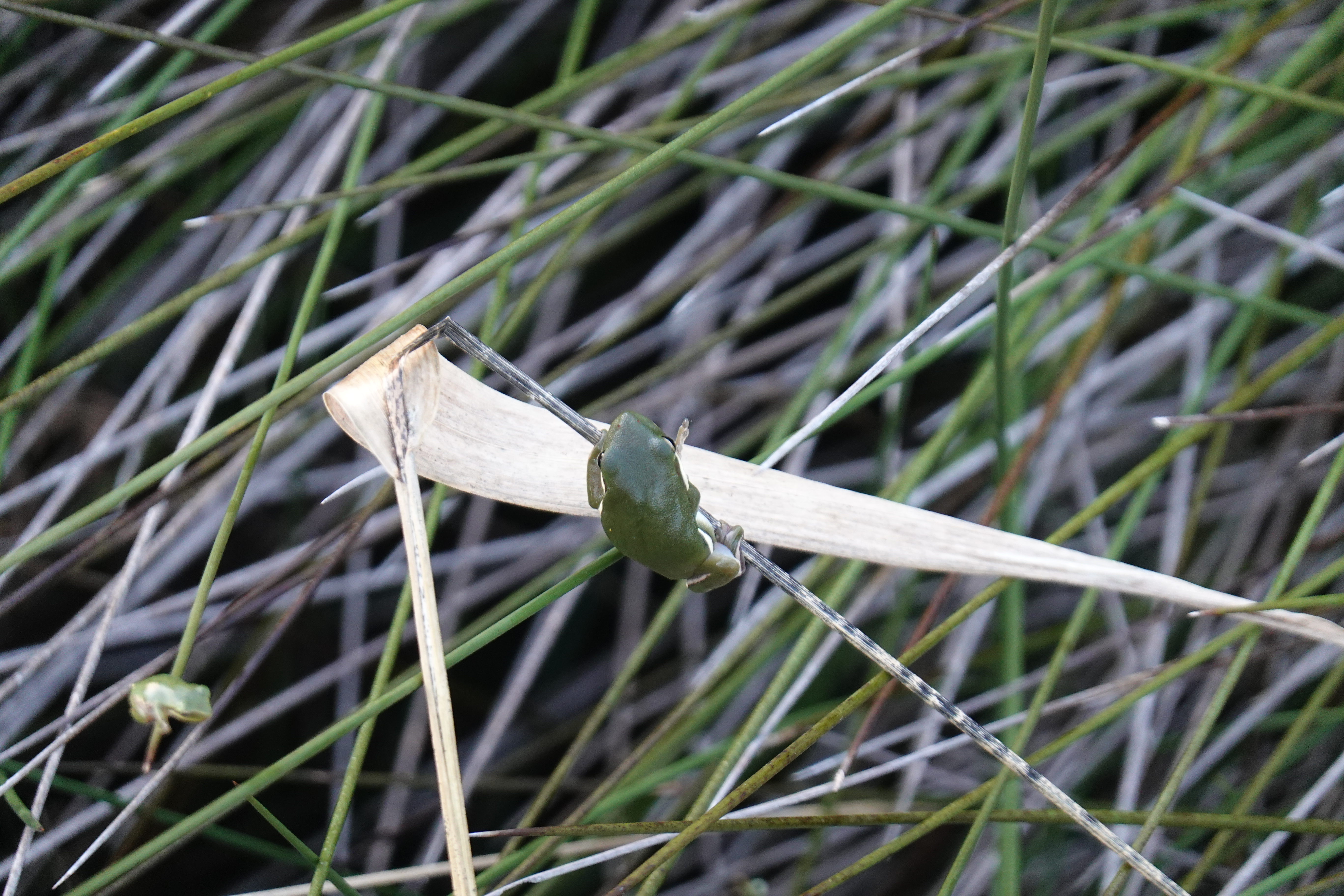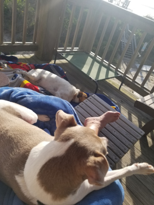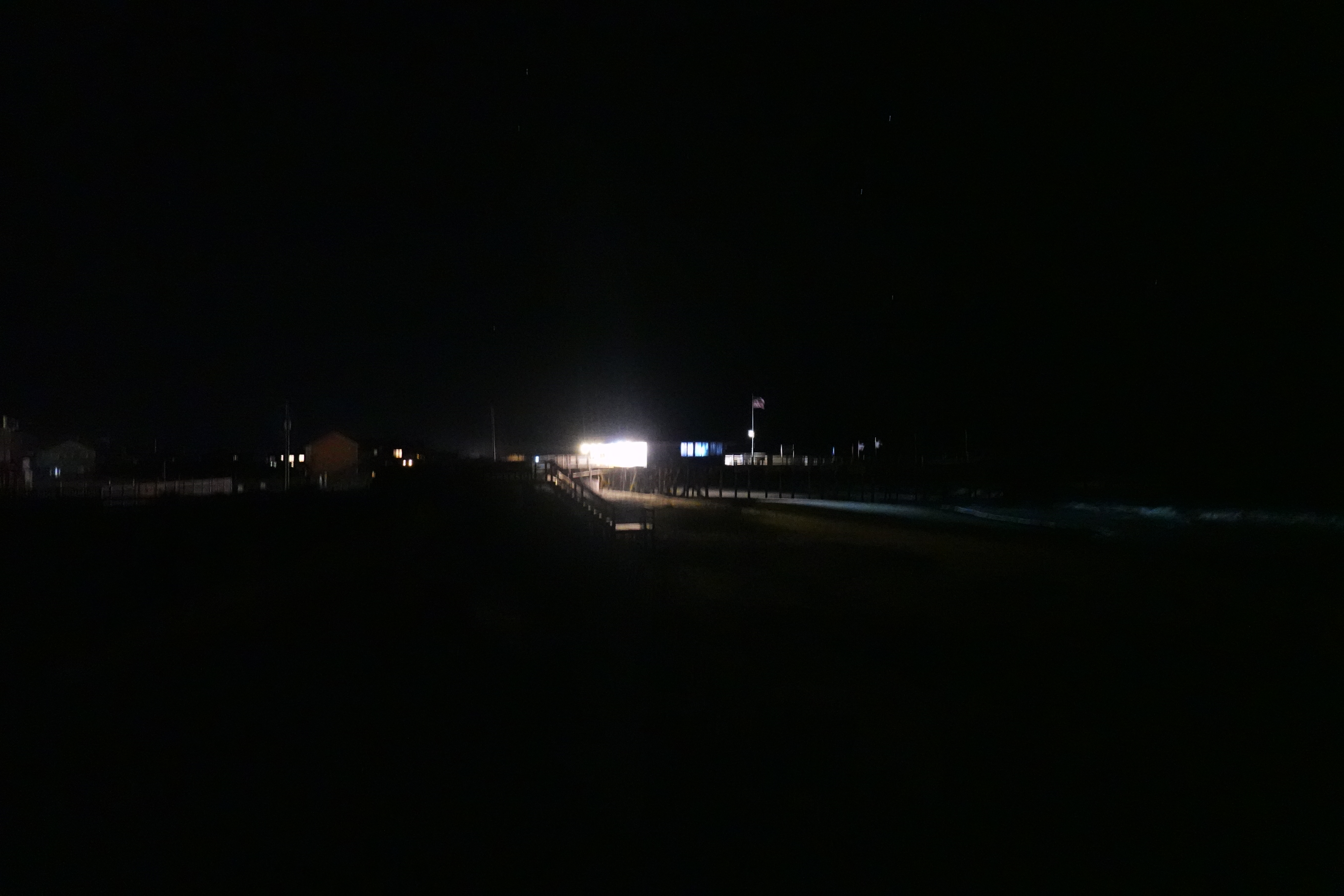 Our walks were limited. Dufus Number One and Dufus Number Two both started chasing a ground hog into the woodpile at home. Both learned they could throw themselves into the air and leap onto the wood pile. Both hurt their leg. Both are here now nursing injured legs. We were able to check out the house fire that happened last month at the dead end of Dory Lane into Starboard Drive. There is all kinds of crabbing about there not being enough help. Hatteras Realty runs a bus and brings people in. We saw a full size heron just like those in Ohio. Cappy was around to say hello. Still hanging out on the northeast shore of the pond behind Hatteras Realty. A frog said hello. The pier at night. Another great trip. Here's our walks: