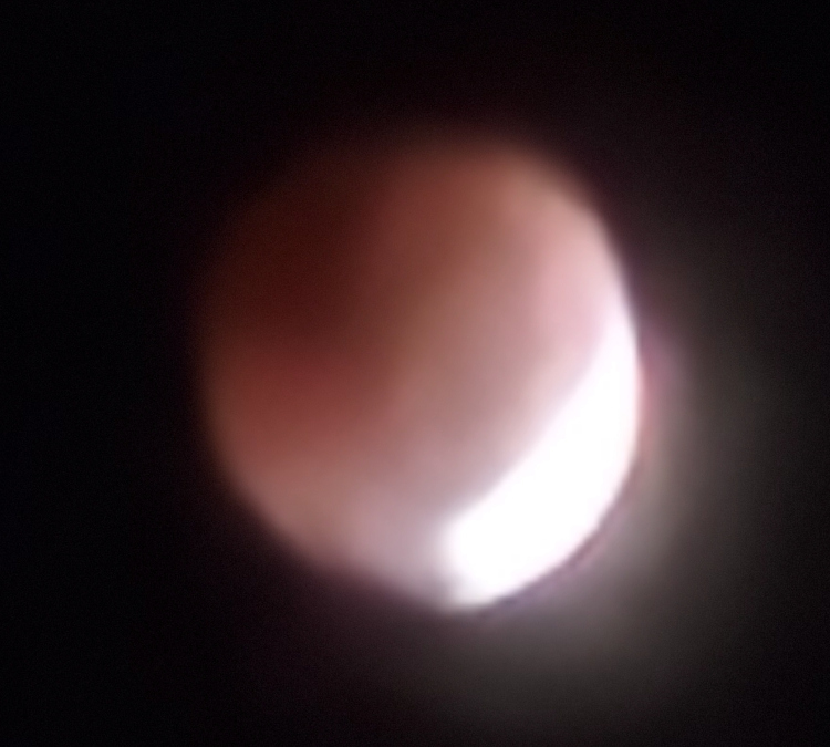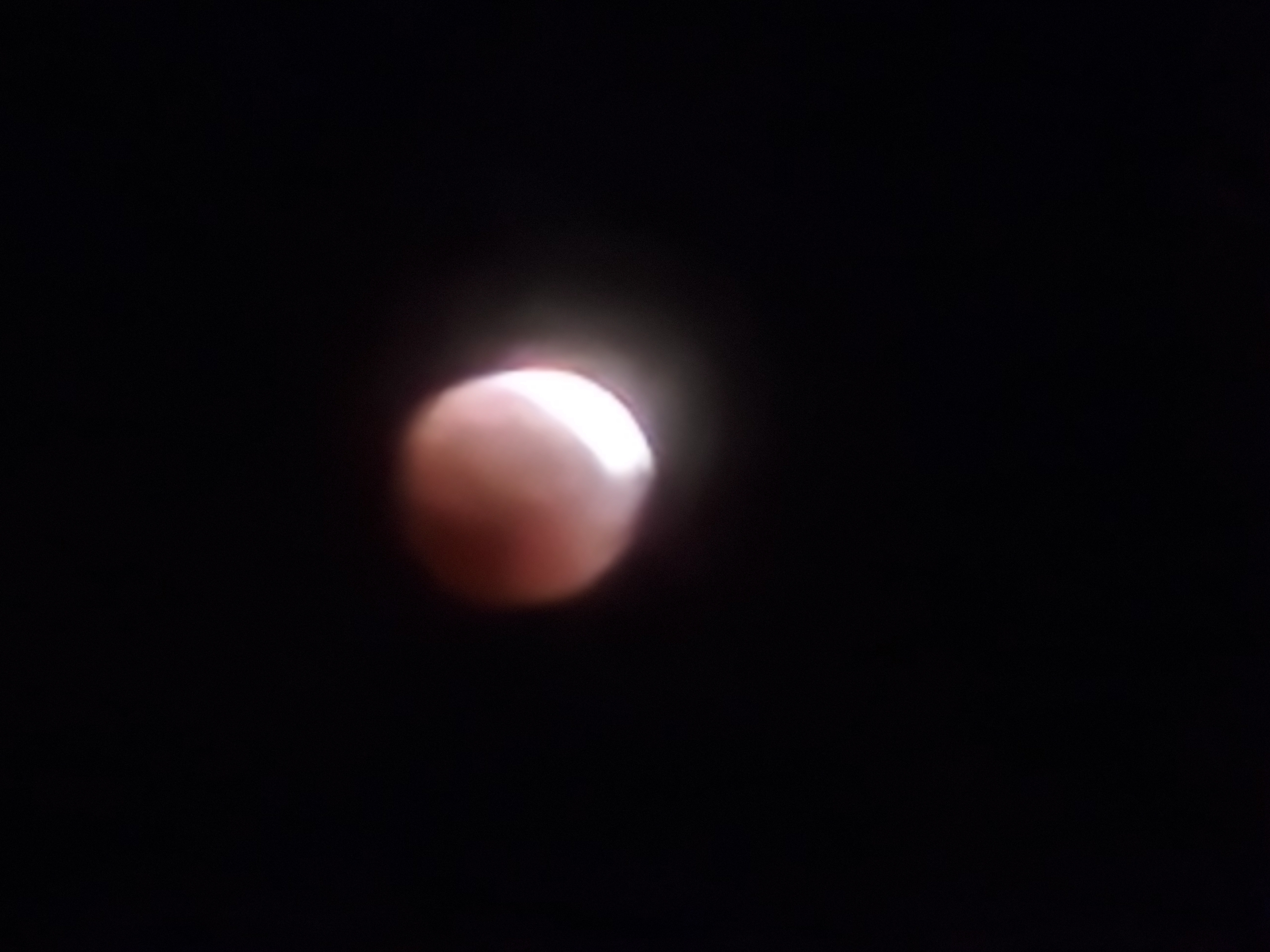 Gorgeous clear nights with a full moon. Heaters are working great. Took the dogs out at around 5:30 am and wondered where the moon went. Remember there was a total lunar eclipse! Rotten picture but ....
