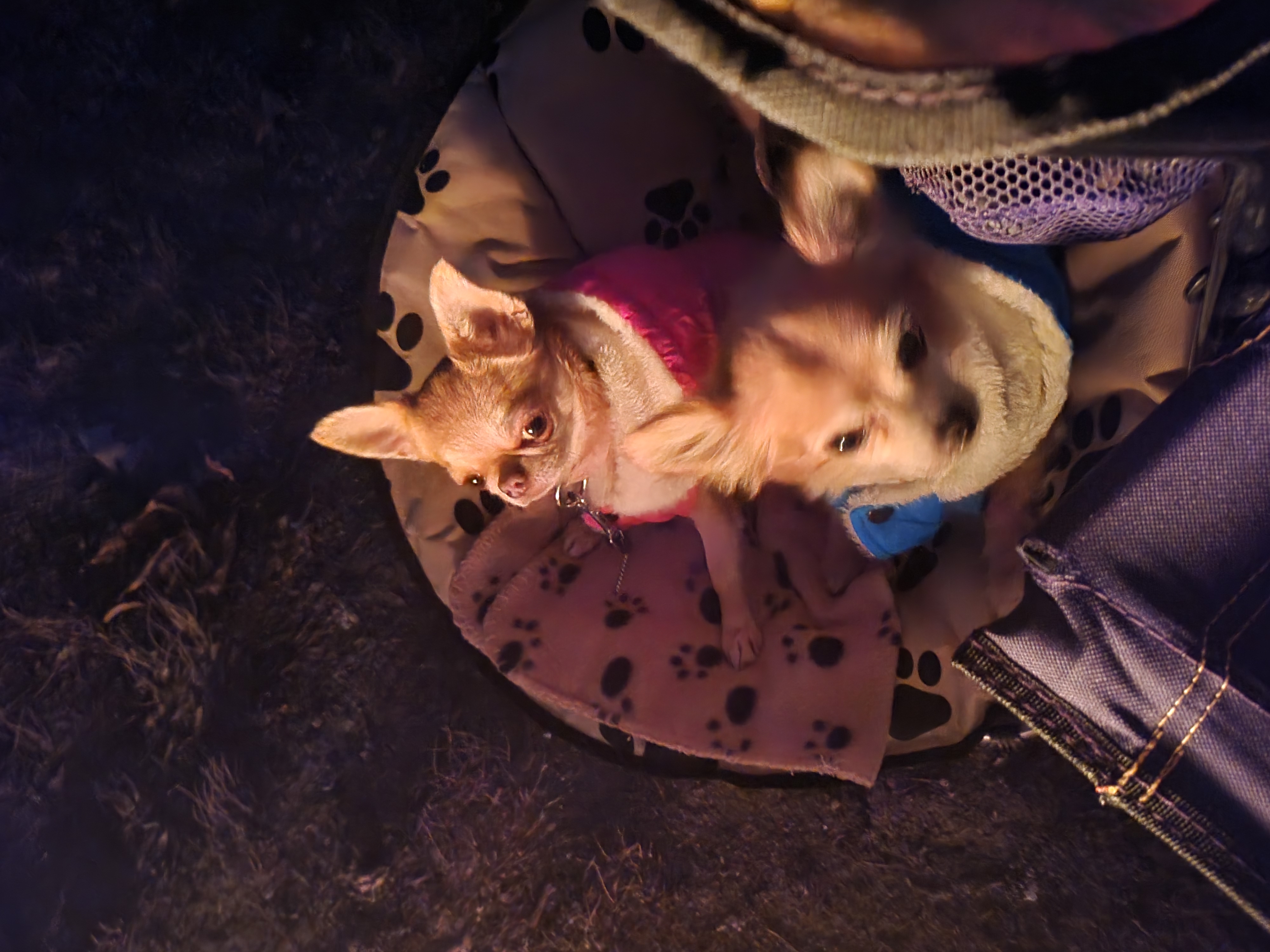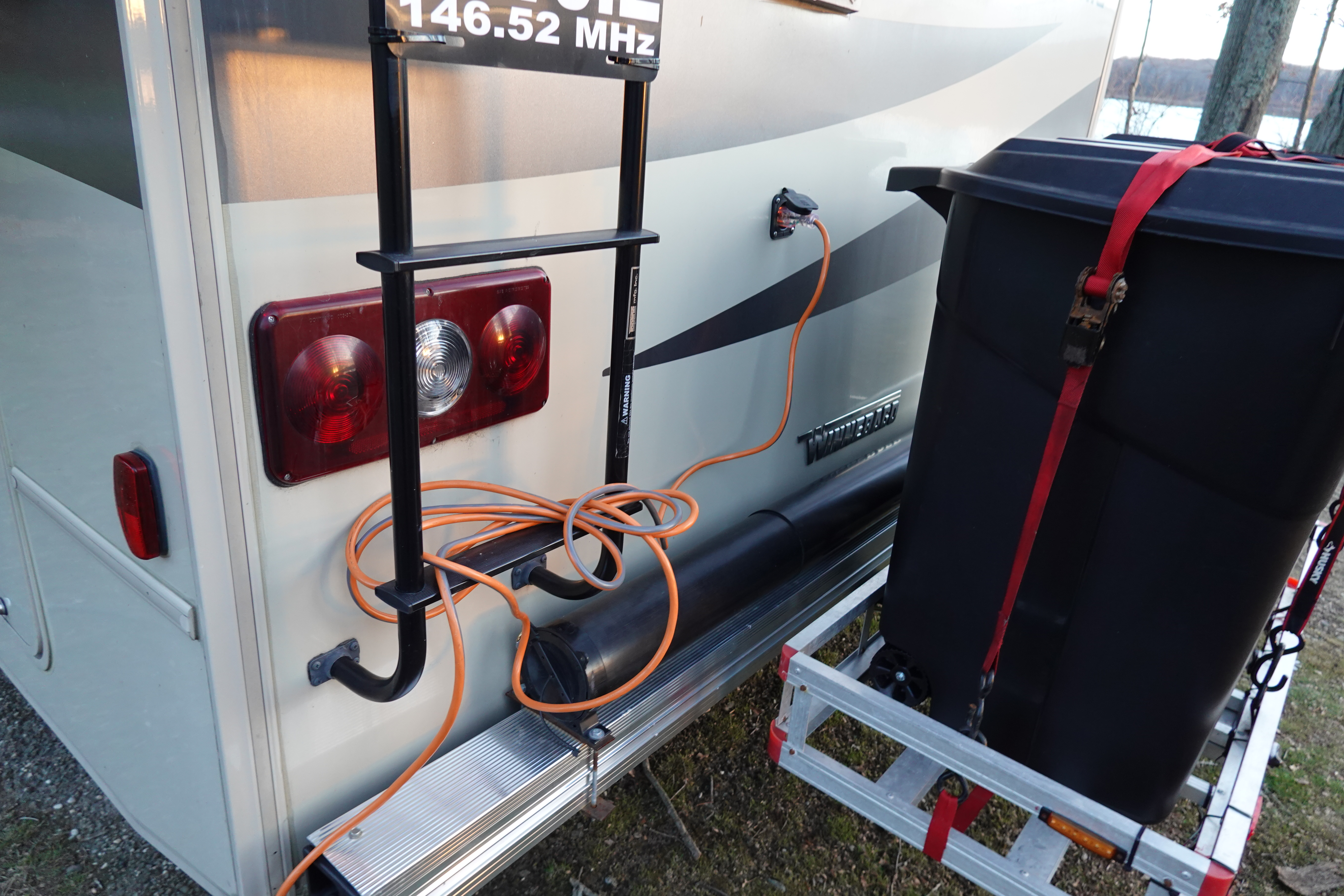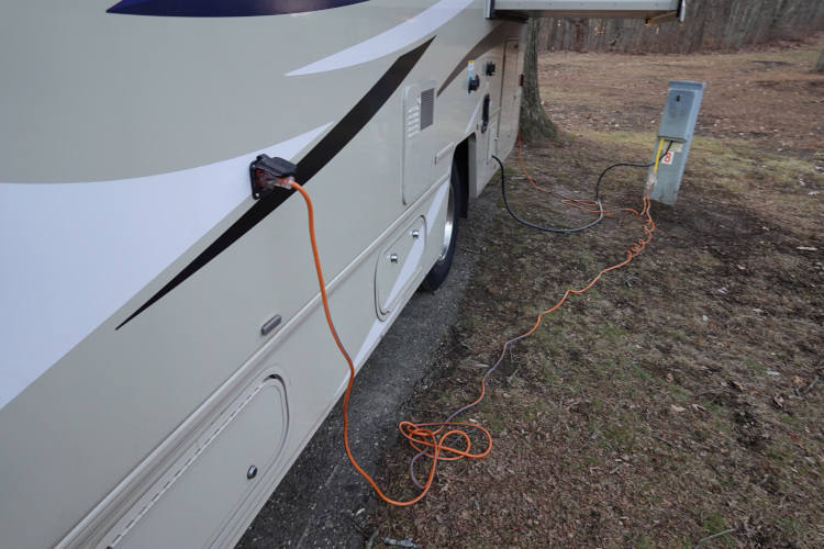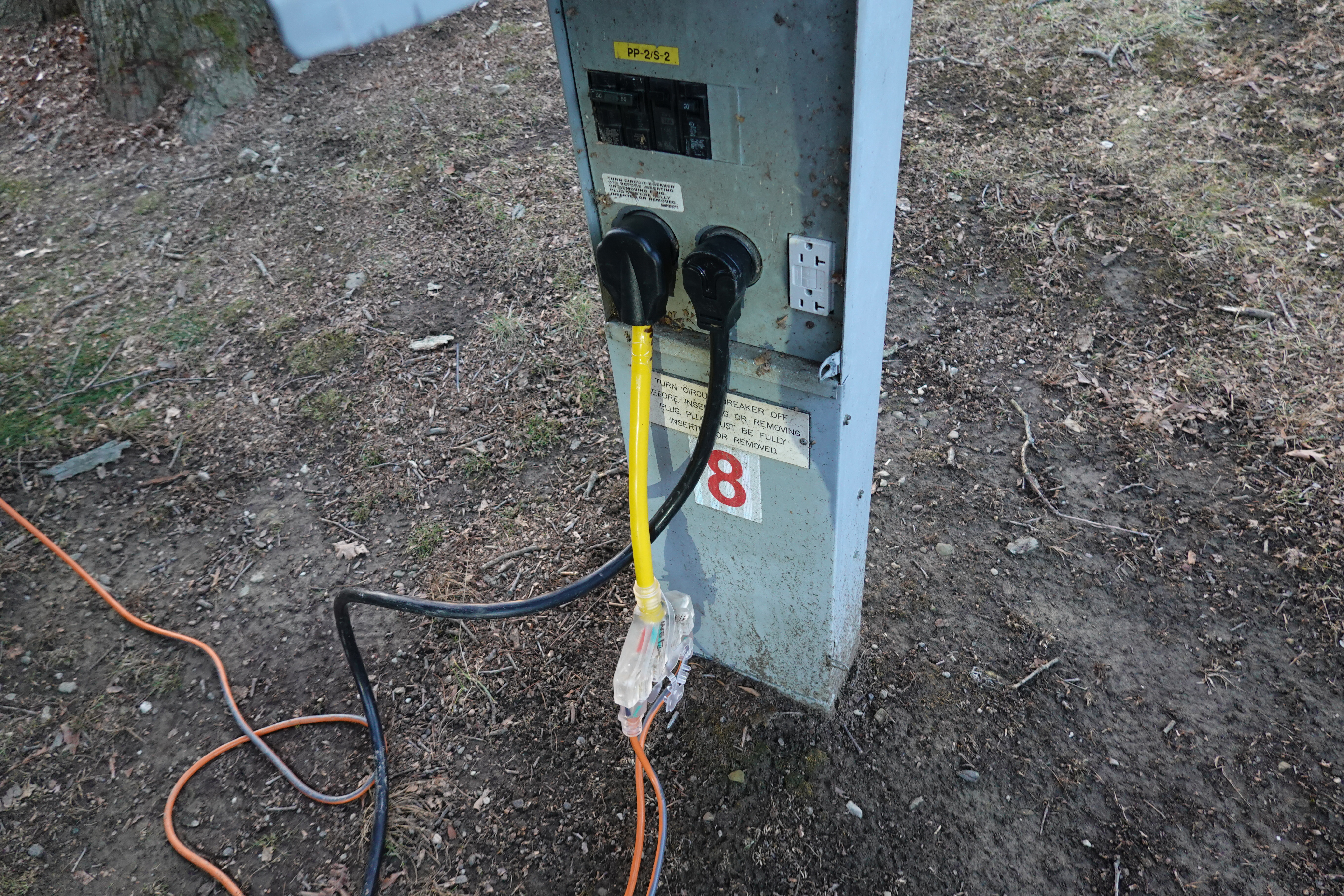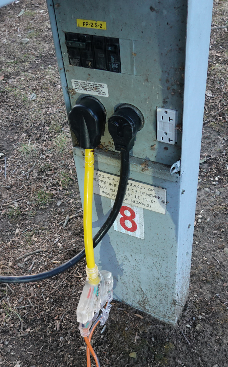 spaces. Here's all the beaver stumps but they are hard to see. Fire Chihuahuas had to wear their coats: After a few nights and days below freezing, these six squirrels climbed to the top of this large tree and were napping in the bright sun. The extra thermostat-controlled power ports worked FANTASTIC! One in the rear and one on the driver's side. They plug into an adapter into the 50 amp outlet.