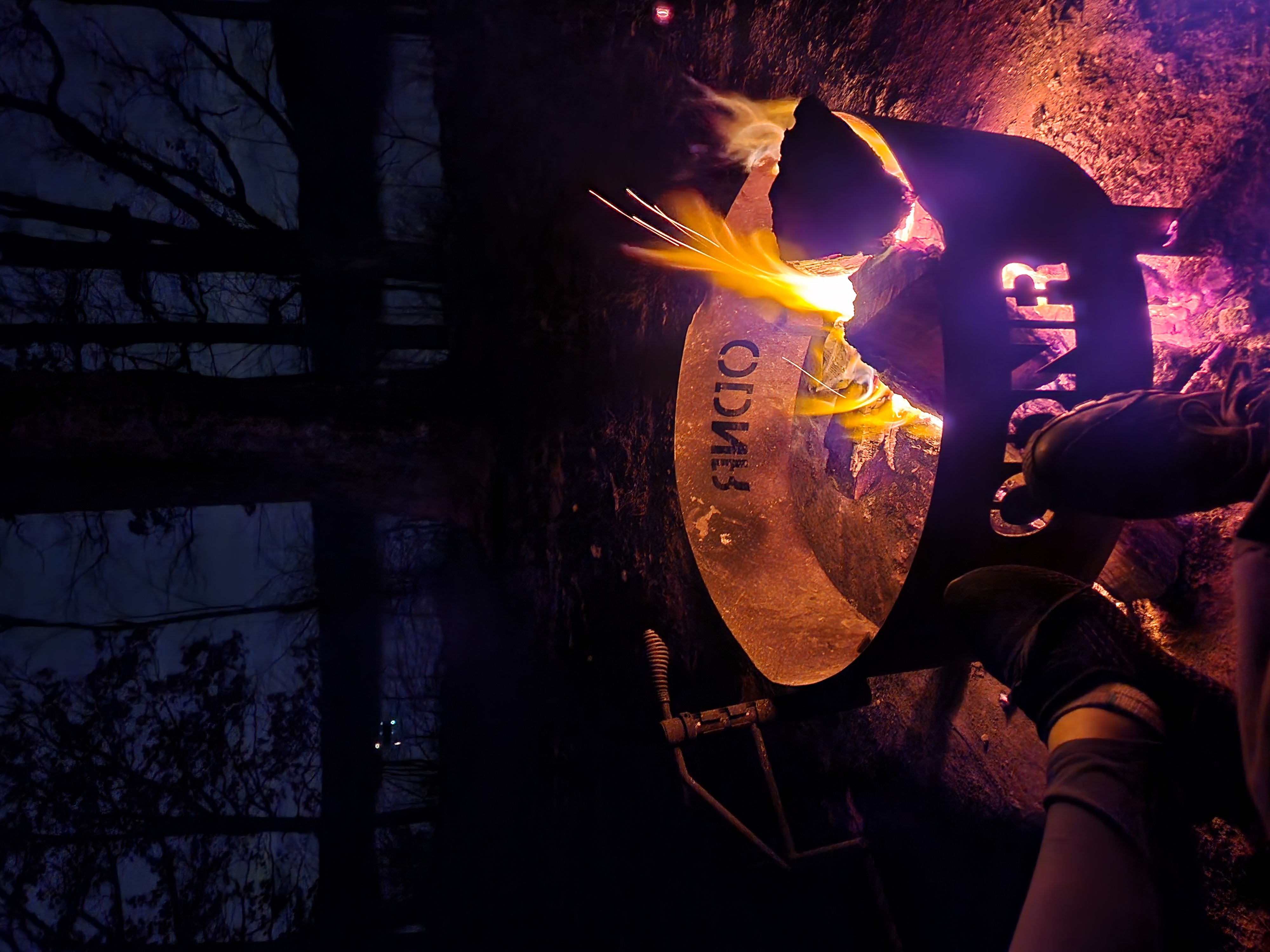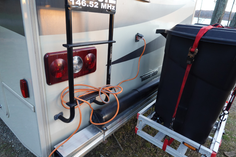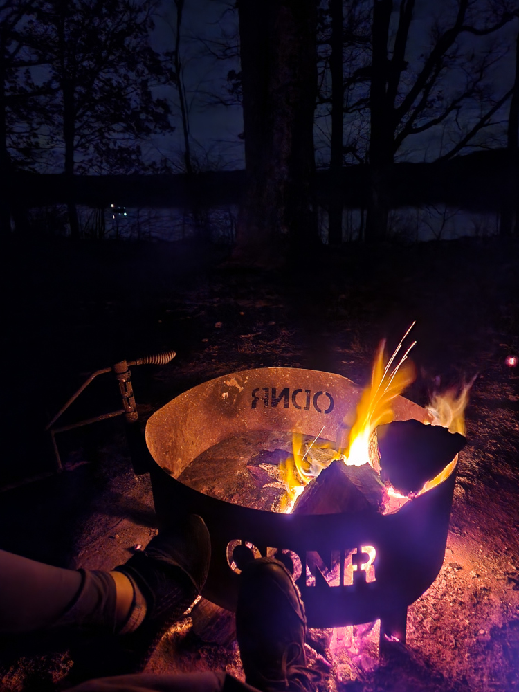 for a higher resolution picture Our first trip in the Mini Winnie in sub freezing weather. We left just above freezing with temperatures in the mid-30s the first day. Went to 27 the first night without a hint of a problem. The rest of the trip was above freezing. We were camped with a good view of the lake. I strapped on two garbage cans to hold wood and glad I did. The extra capacity really helped with the fire. Fire by the lake ... with a boat night fishing in the background.