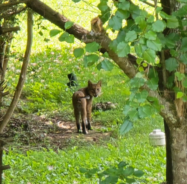 While doing his fatherly duties, washing baby bottles, Matt spotted a bobcat in our yard. Awesome again.