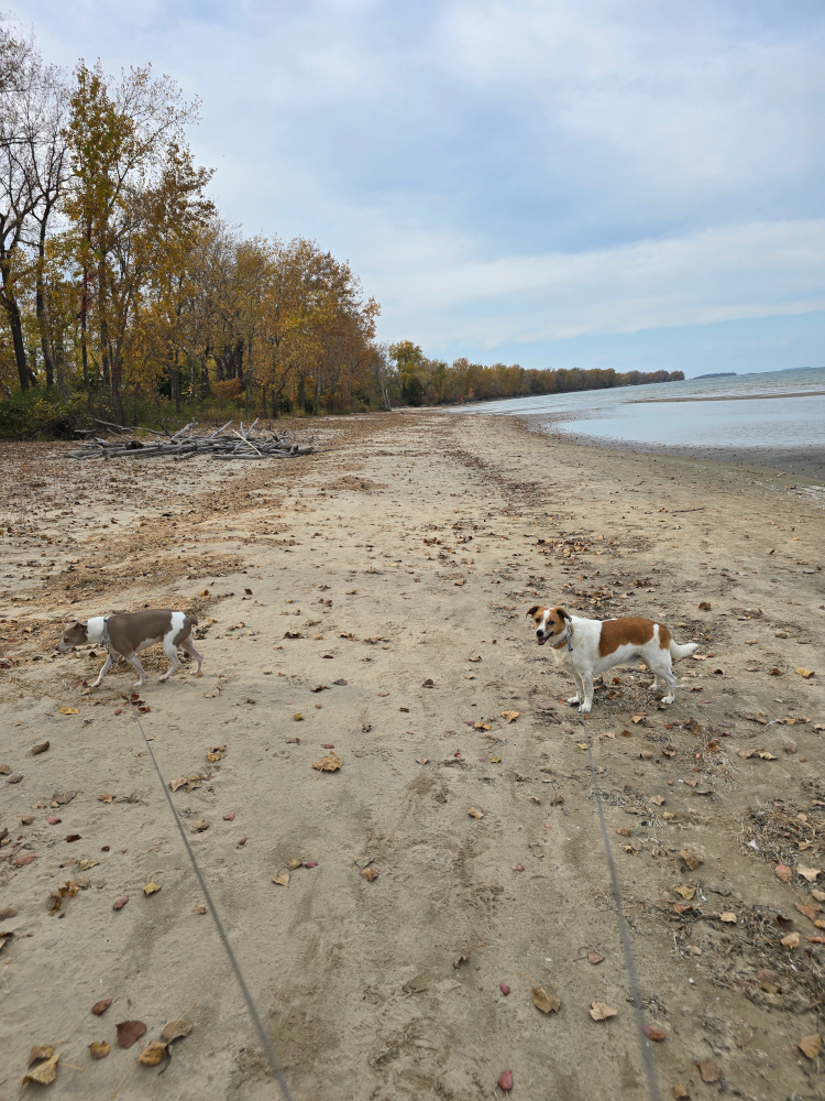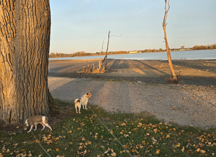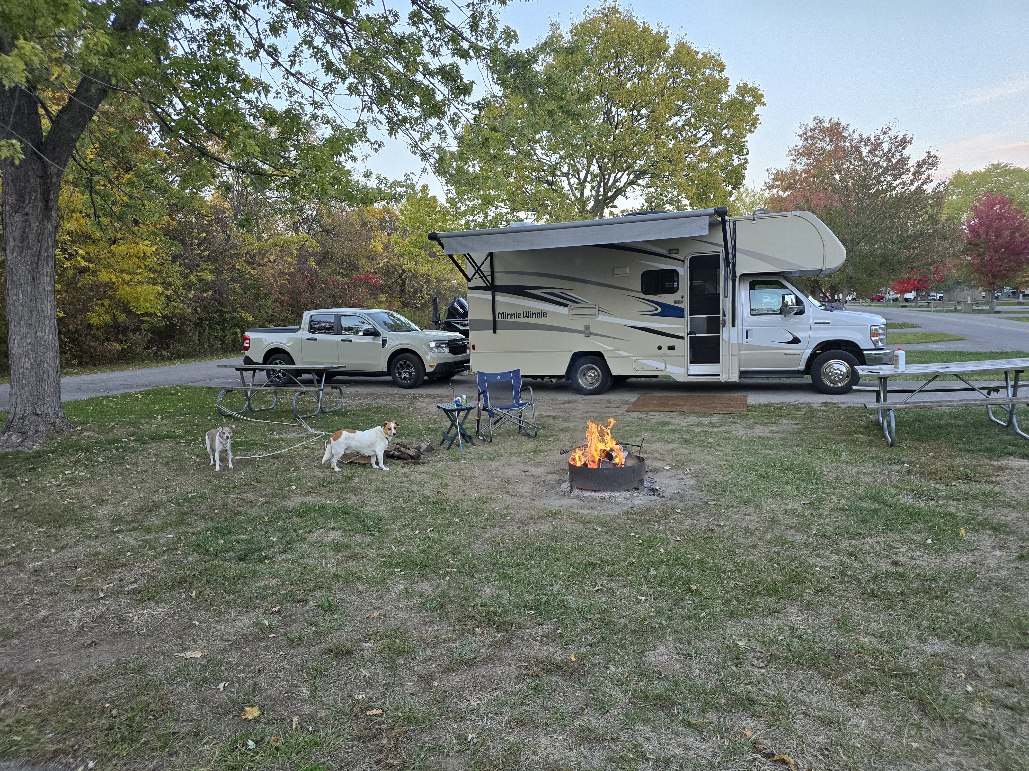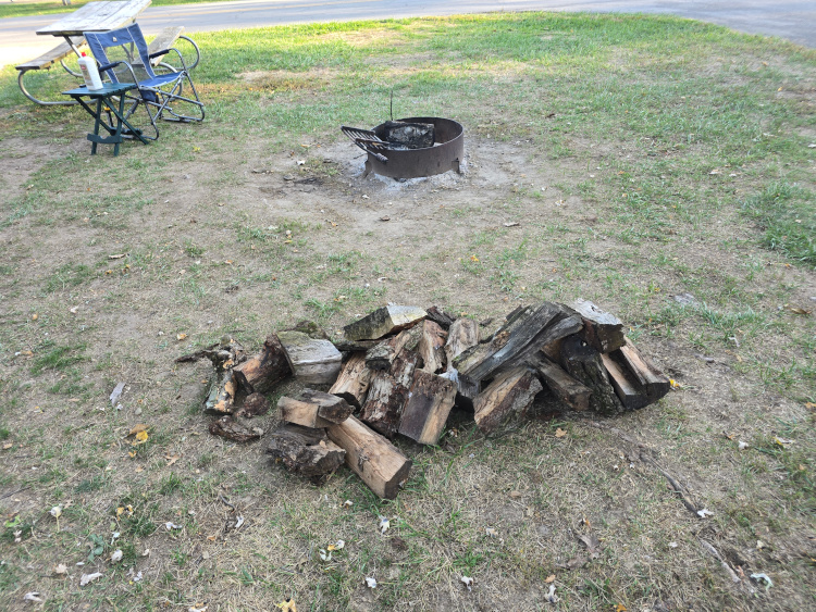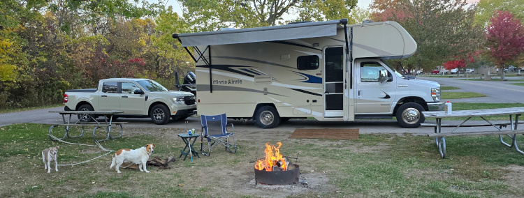 First some statistics: The motorhome-truck combination is forty-four feet long. The towing mileage does NOT register on the Maverick. We took our first car trip to Catawba Island State Park and found what could only be described as a goofy joke. The entire state park consists of a boat ramp. That ramp is hemmed in by VERY TIGHTLY packed, expensive looking condos and homes. It is not in any way a park. It is a state-operated boat ramp. Not that this is bad, but if someone was looking for a walk in the woods, well .... Lots of wildlife. While coming back into the park, we came upon a deer that watched the goofy out-of-control dogs having a fit. There are hundreds and hundreds of squirrels. I don't understand the lack of raptors given the number of dinners available. I brought two large containers of wood. One container is enough for two nights.