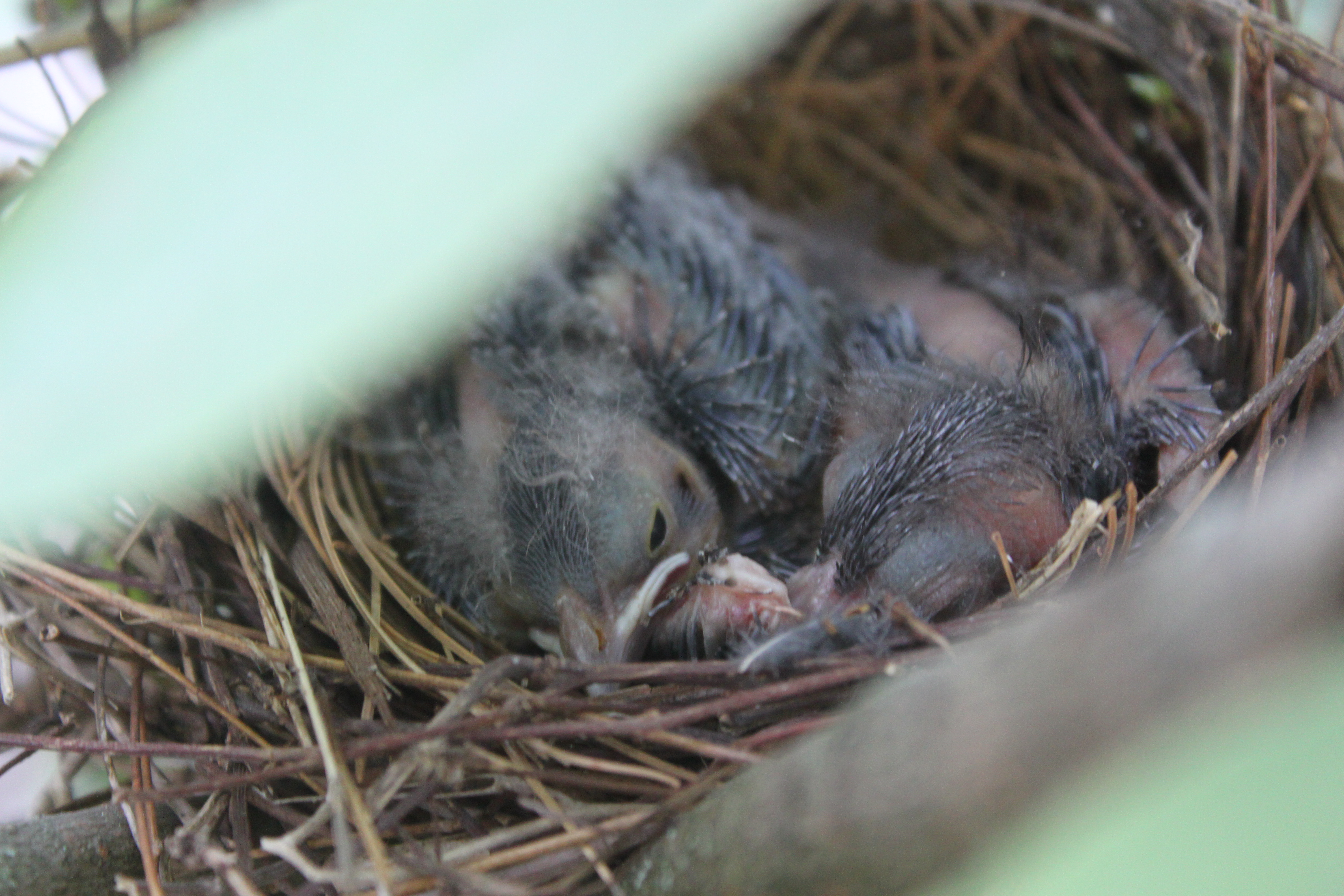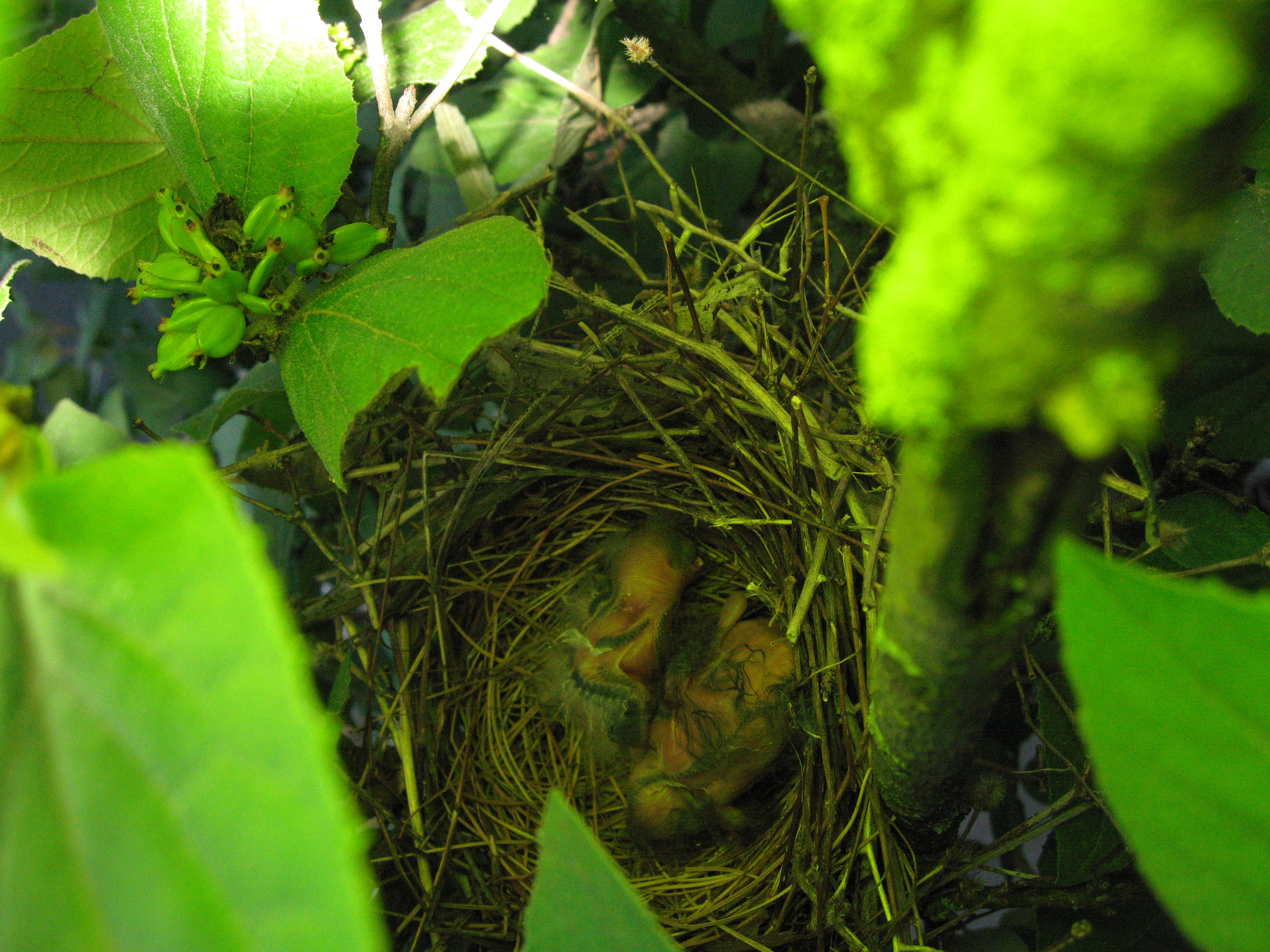 June 11, 2011 - Where'd they go??? After watching a number of sparrow nests raided by a maurading bluejay, I hope they survived. I saw them out exercising their fully feathered wings. There was absolutely no room left in the nest. I've never seen such young birds fly, but, I hope.