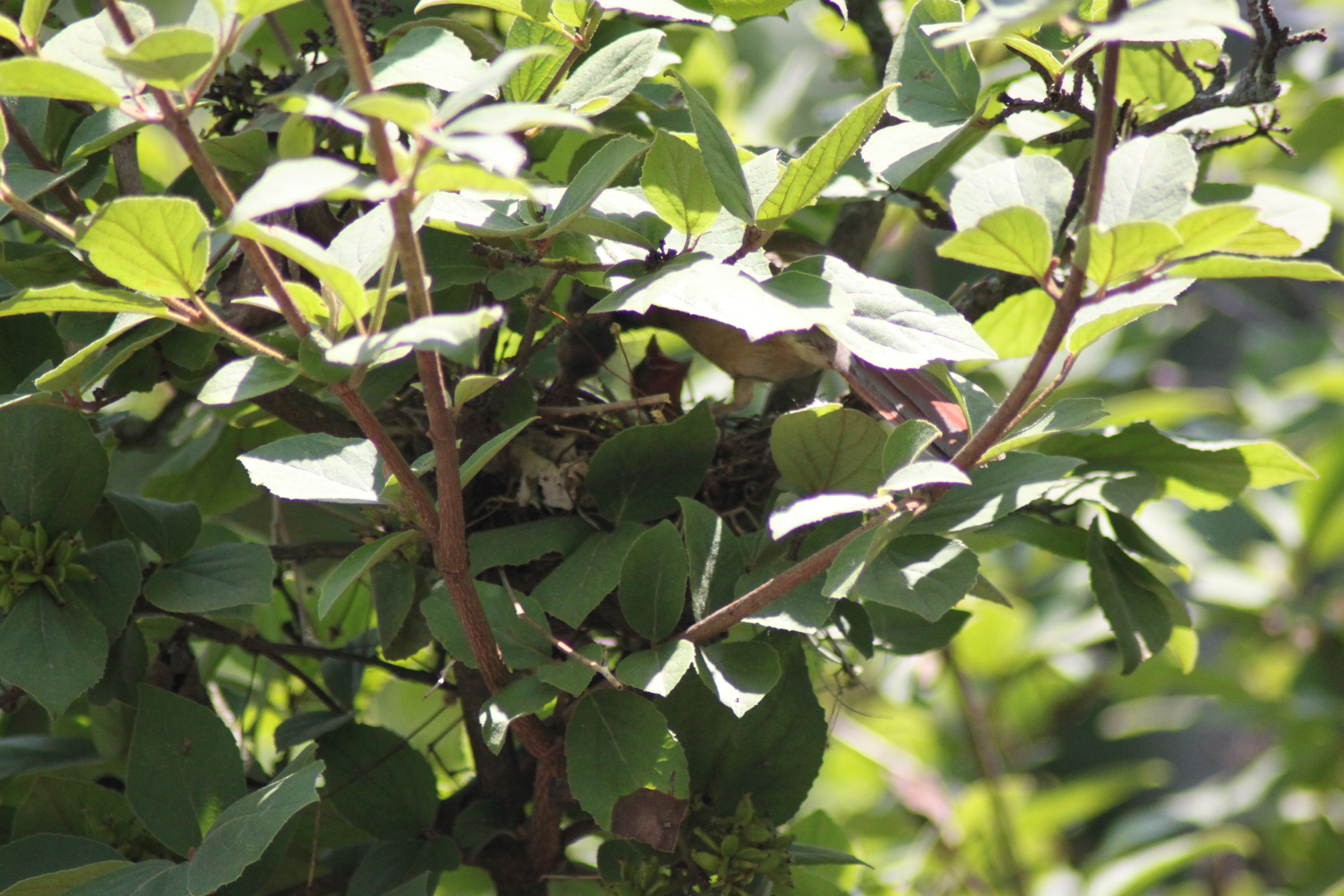 For some reason, a pair of young cardinals decided that the small bush beside my antenna tower and very near my back porch offered a perfect location for a nest. Mom dutifully laid two eggs and those eggs turned into chicks. I took some pictures, sitting for hours on my back porch watching Mom and Dad come and go.