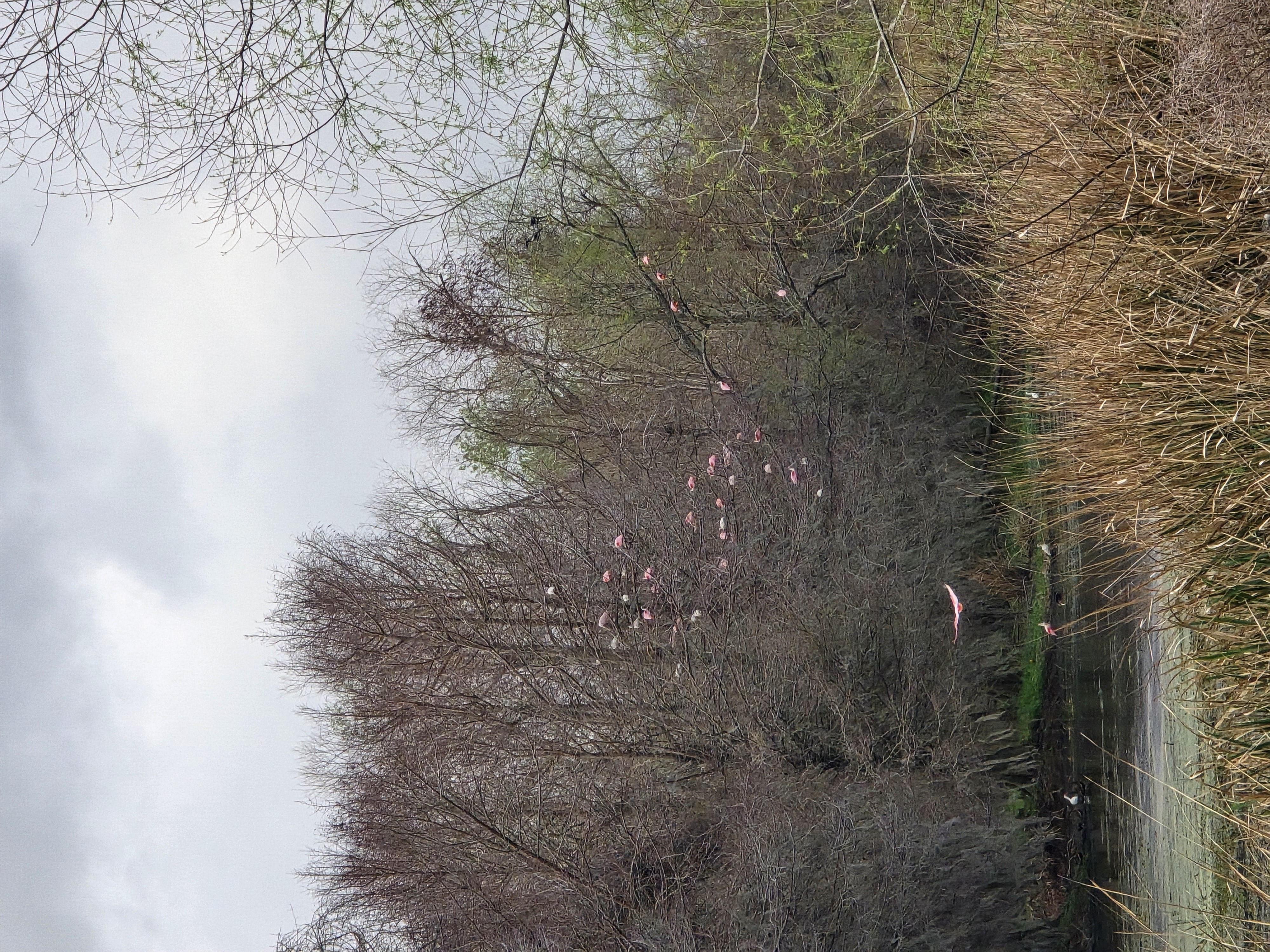 the cloud of Rosetta Spoonbills landed on a tree